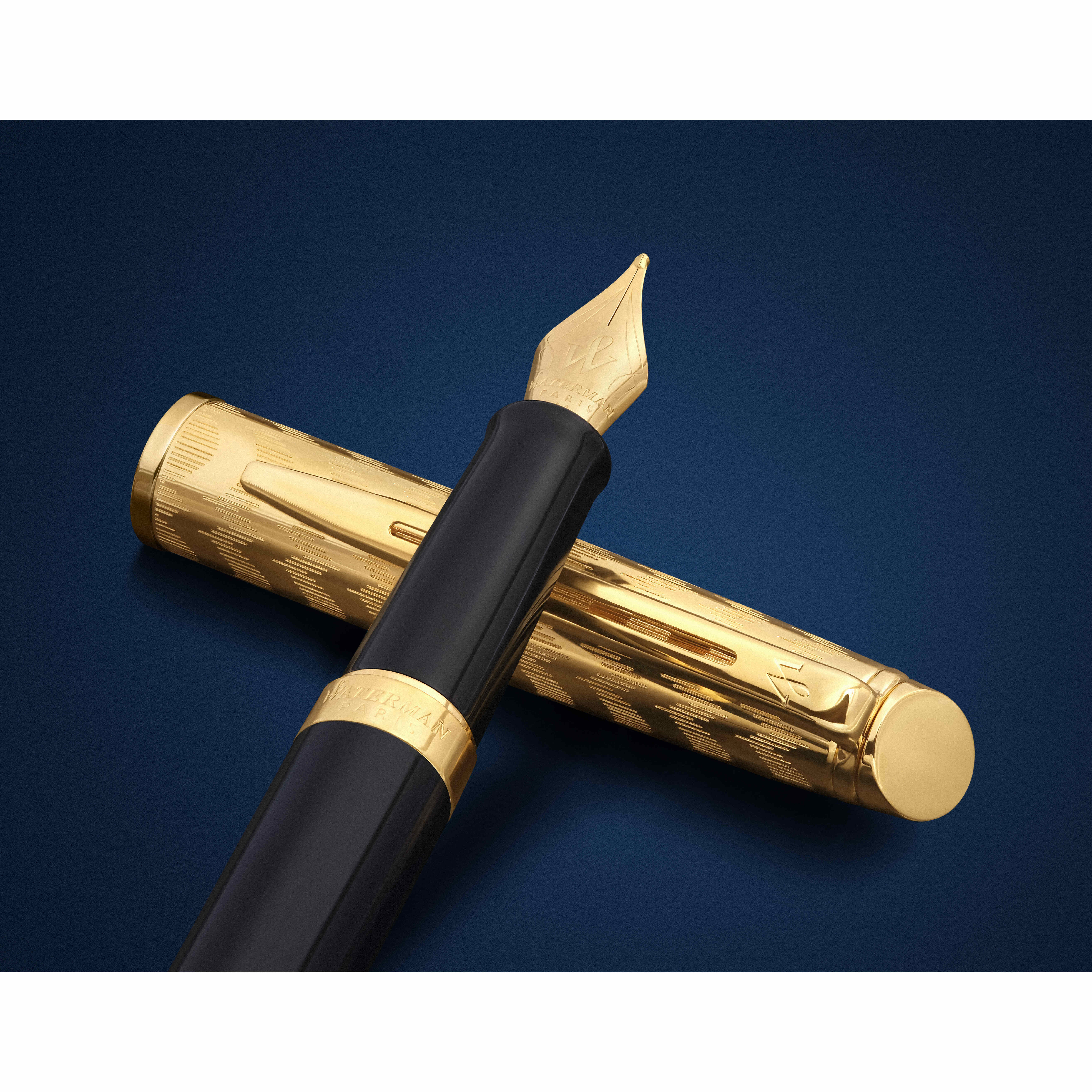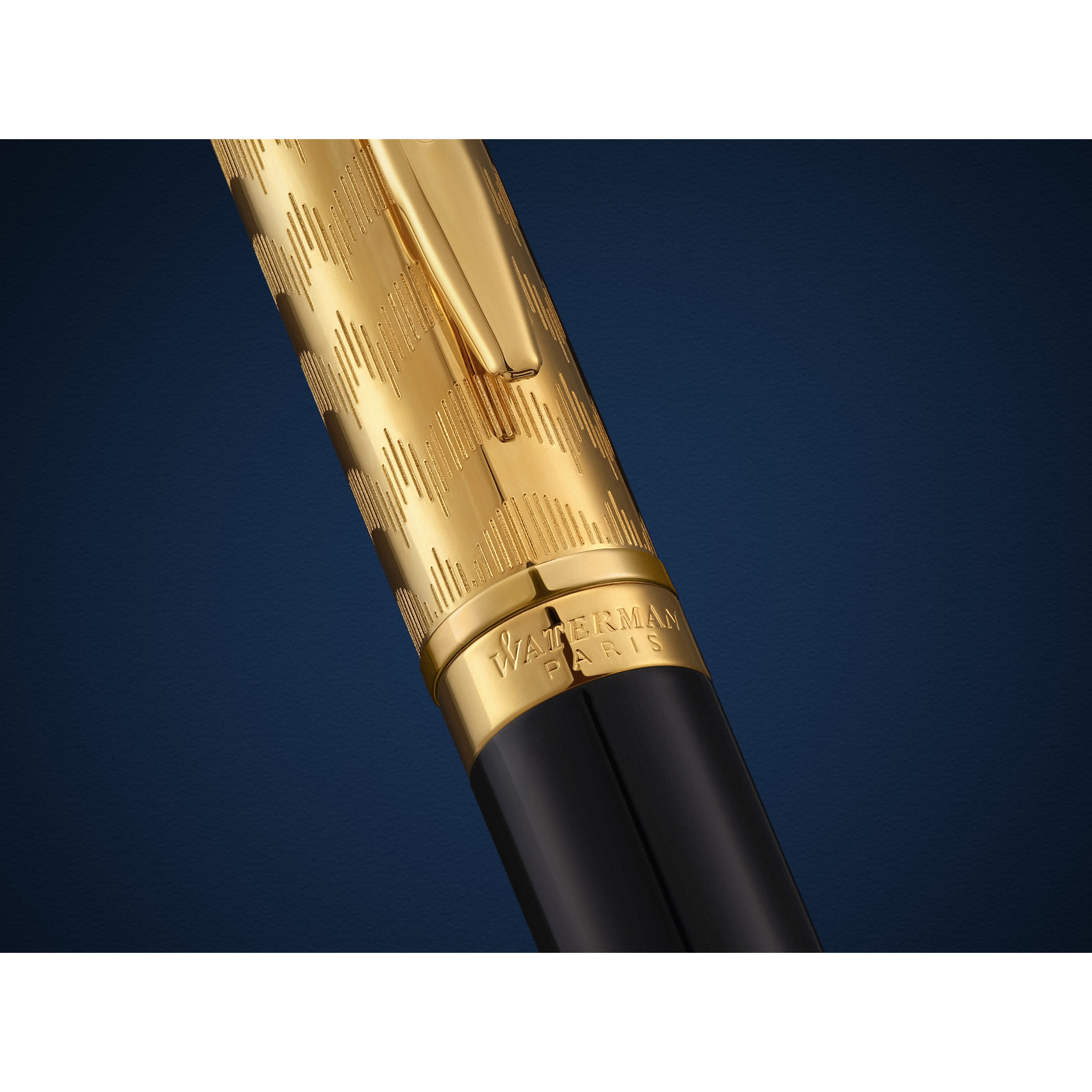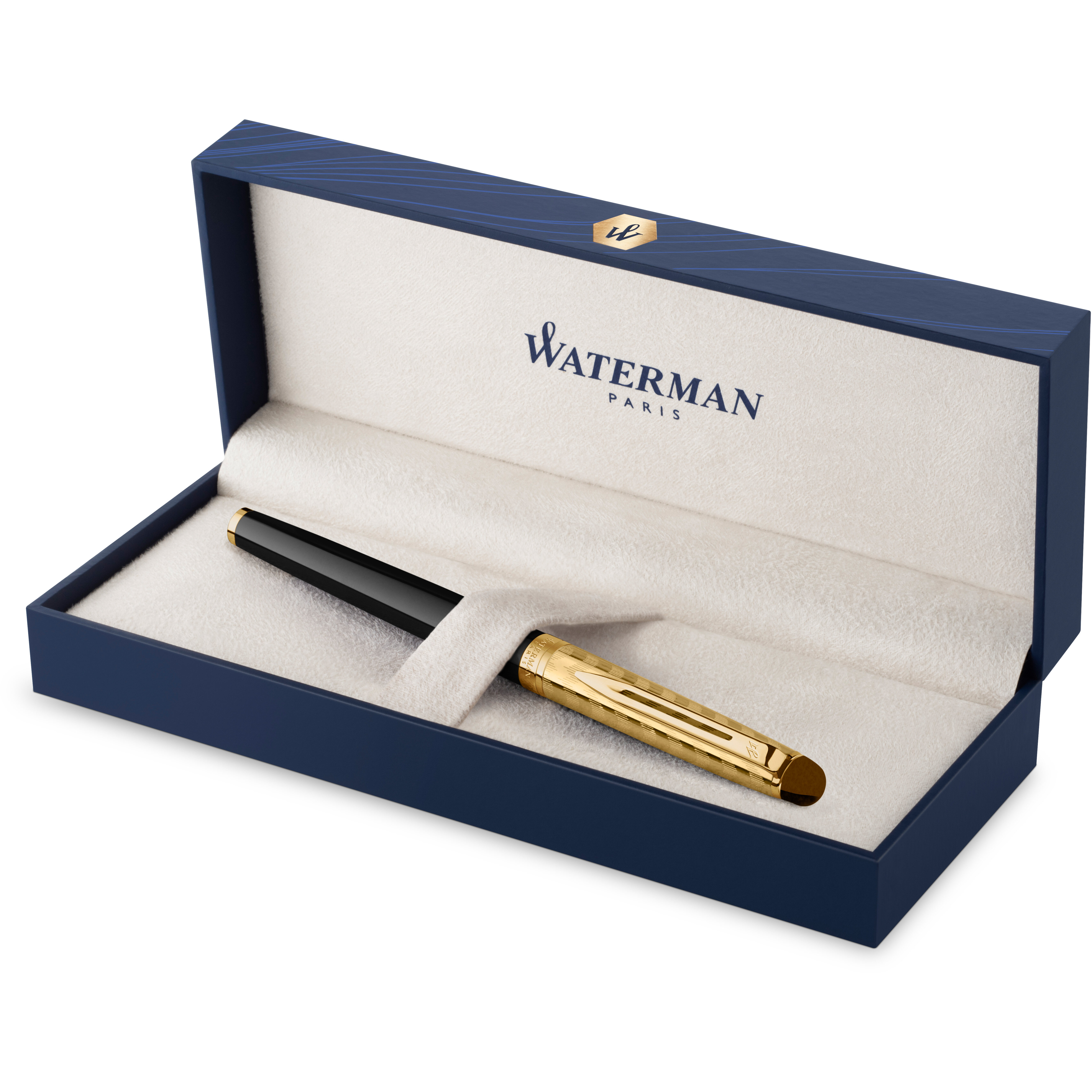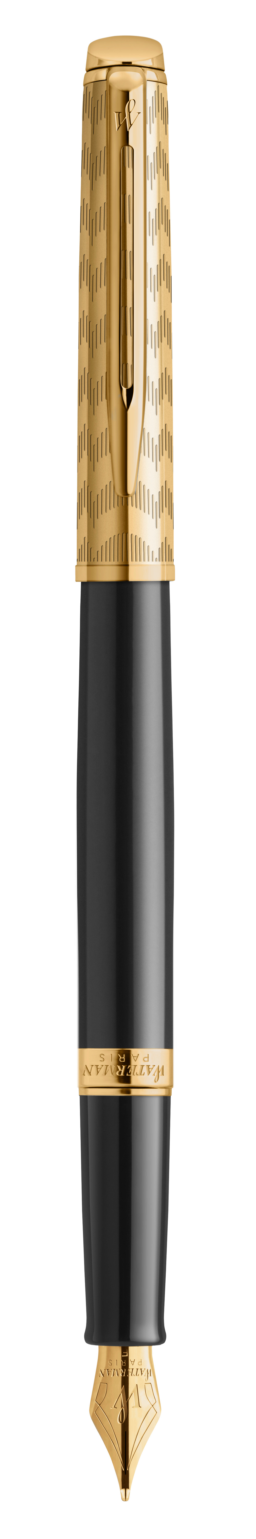So wie die Große Oper jahrhundertelang ihr Publikum inspiriert hat, begeistert heute die exklusive Waterman Opera Kollektion. Die elegante, schmale Form des Hémisphère und die tiefschwarze Lackierung am Schaft ergänzen perfekt die exquisite, vergoldete Kappe und Heritage-Gravur im Stil der kunstvollen Ornamentik der Oper. Die vergoldete Edelstahlfeder des Füllfederhalters zeigt das klassische verschlungene W-Waterman-Design und unterstreicht zusammen mit dem charakteristischen, vergoldeten Clip mit zwei Zacken die raffinierte Eleganz des Schreibgeräts. Jedes Schreibgerät wird mit Watermans gallischem „Savoir-faire“ sorgfältig in Frankreich von Hand hergestellt und zusammengefügt.