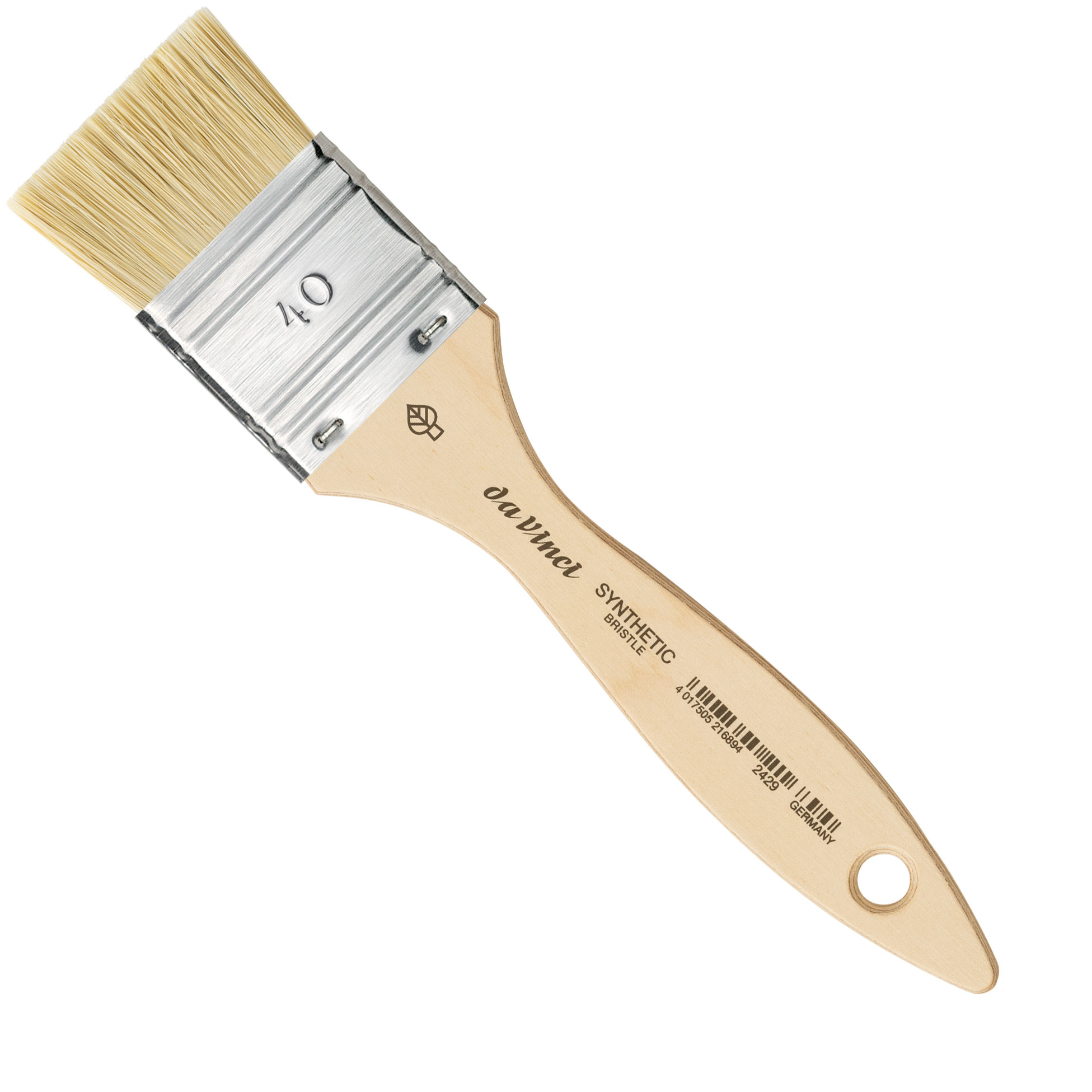 Über Jahre hat die Marke Da Vinci eine Produktionstechnologie für Breite Pinsel entwickelt, um diese noch langlebiger zu machen. Eine speziell ausgeformte Verzahnung lässt den Griff tief in den Klebstoffspiegel eindringen und sichert so den Pinselkörper. Breite Pinsel ab 150 mm sind in der Anwendung extra starken Belastungen ausgesetzt - diese stellen die Verbindung zwischen Griff und Pinselkopf vor besondere Herausforderungen. Zur Stabilisierung werden deshalb zusätzlich Nieten eingesetzt. Das Ergebnis: Alle Bestandteile des Pinsels sind dauerhaft stabil miteinander verbunden. Dies gewährleistet eine besonders lange Lebensdauer. Die Synthetikborste kommt der herkömmlichen Schweineborste sehr nahe, ist jedoch wesentlich langlebiger und leichter zu reinigen ist. Bestens geeignet zum Grundieren, für flächiges Malen und vieles mehr.