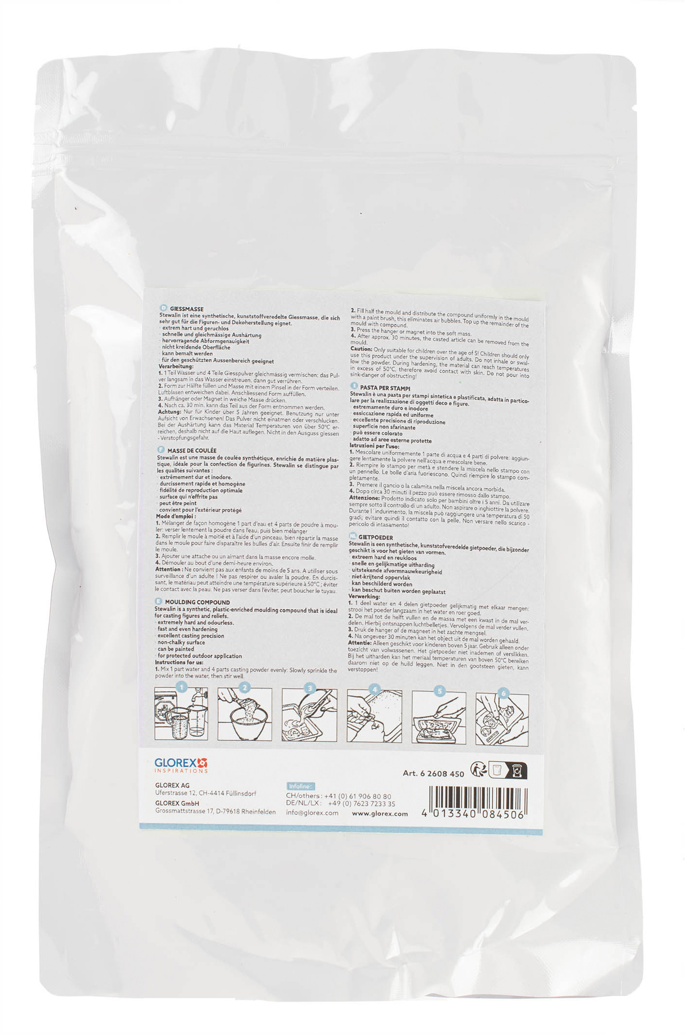 Hochwertige, speziell weisse Figurengiessmasse zum Giessen von Figuren und Reliefs aller Art. Mischverhältnis Giessmasse: Wasser = 4 : 1. Stewalin zeichnet sich durch eine hohe Abformgenauigkeit, eine schnelle Aushärtung (30 Minuten), mühelose Entformbarkeit und eine hohe Bruchfestigkeit aus. Ausgehärtete Gegenstände weisen eine glatte Oberfläche auf und sind witterungsbeständig.