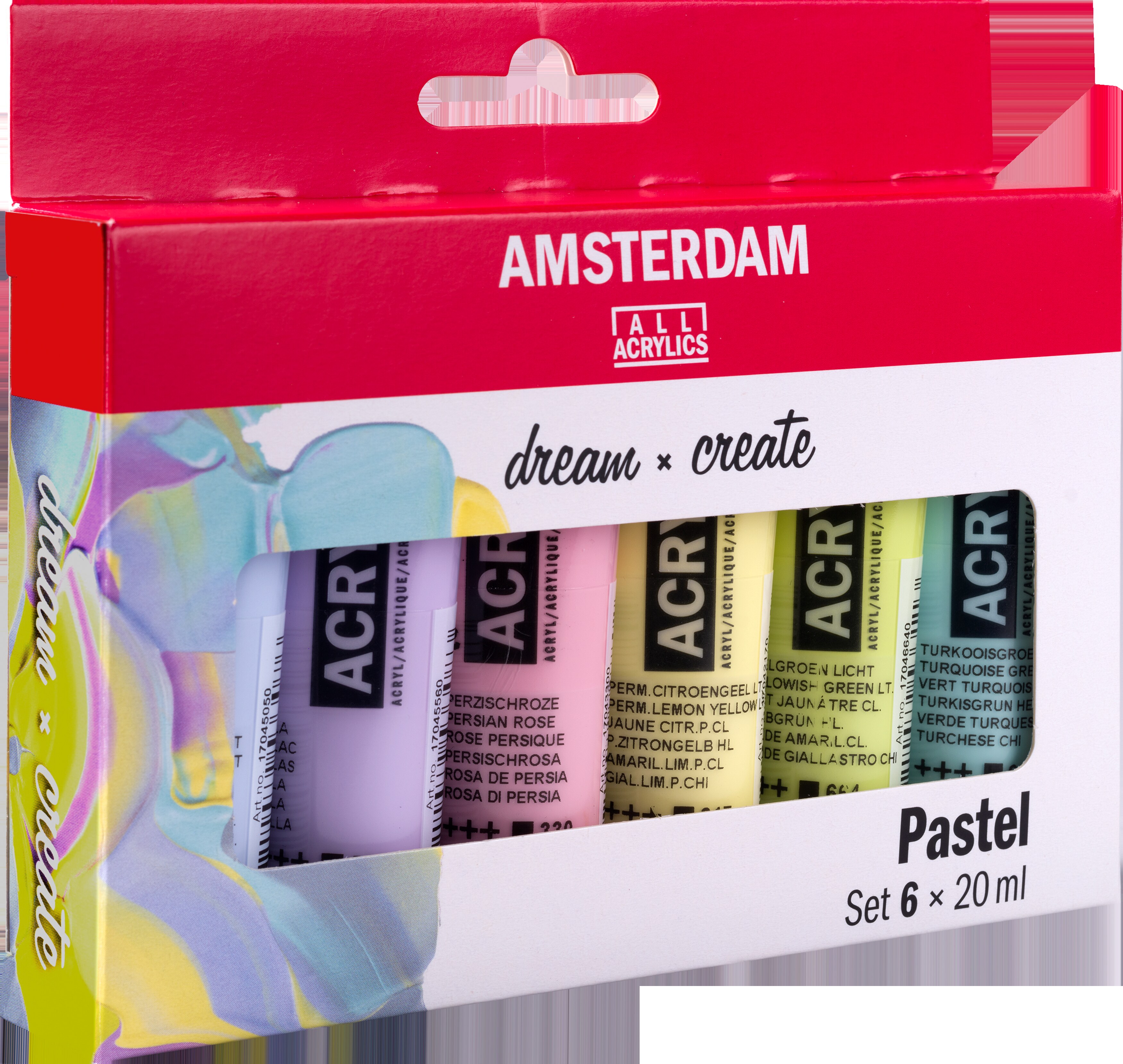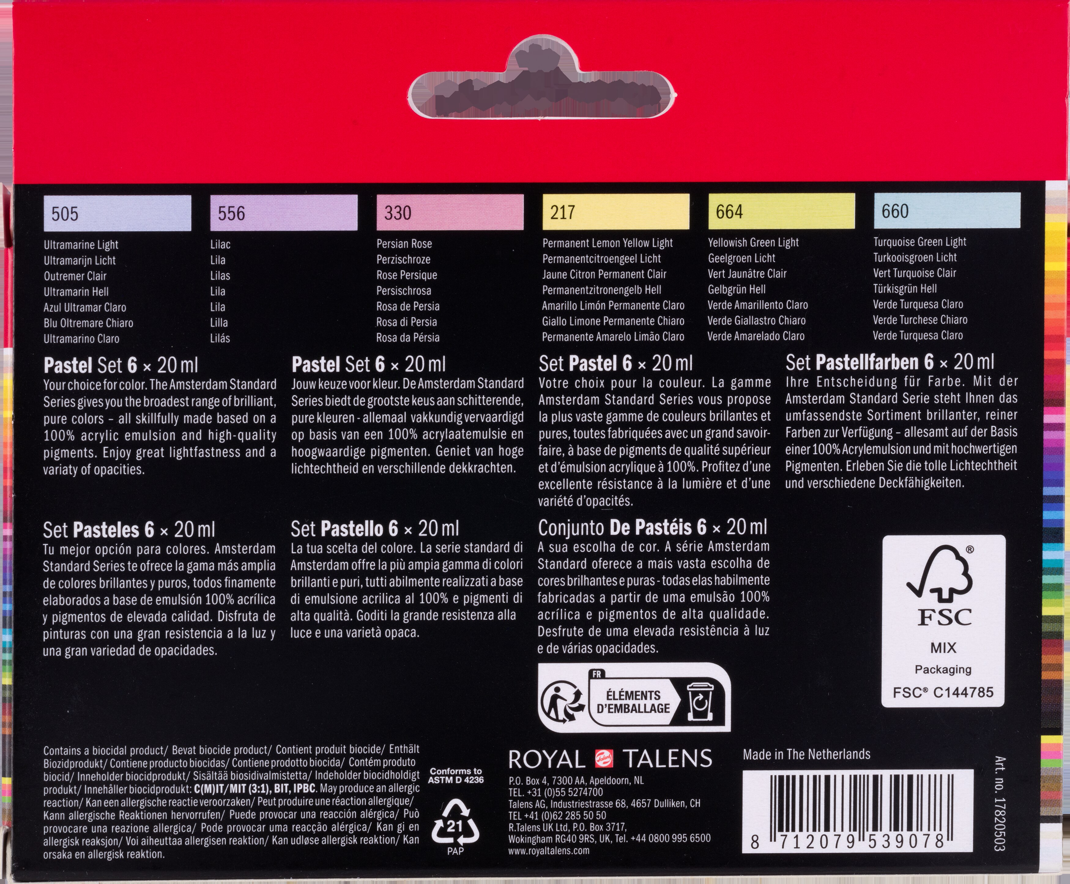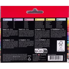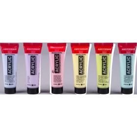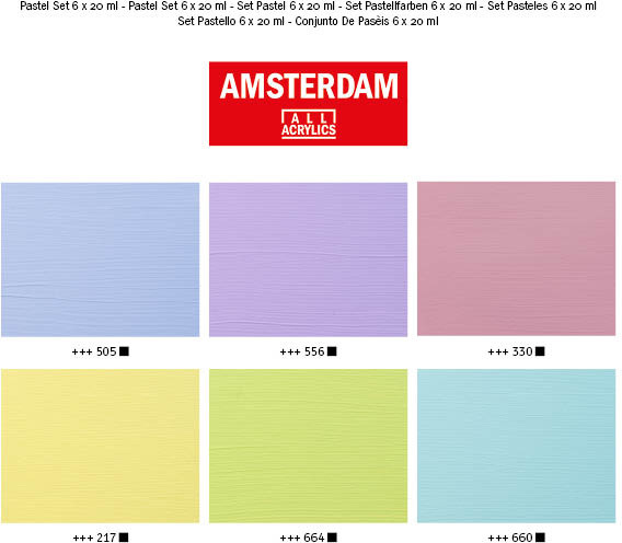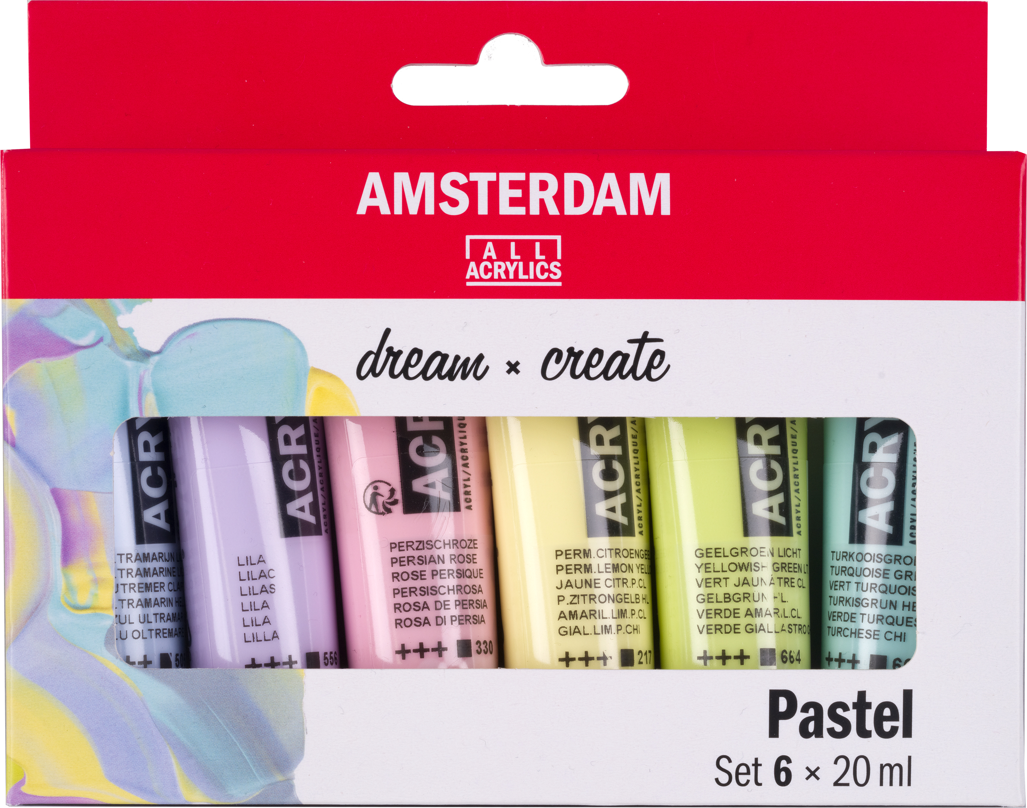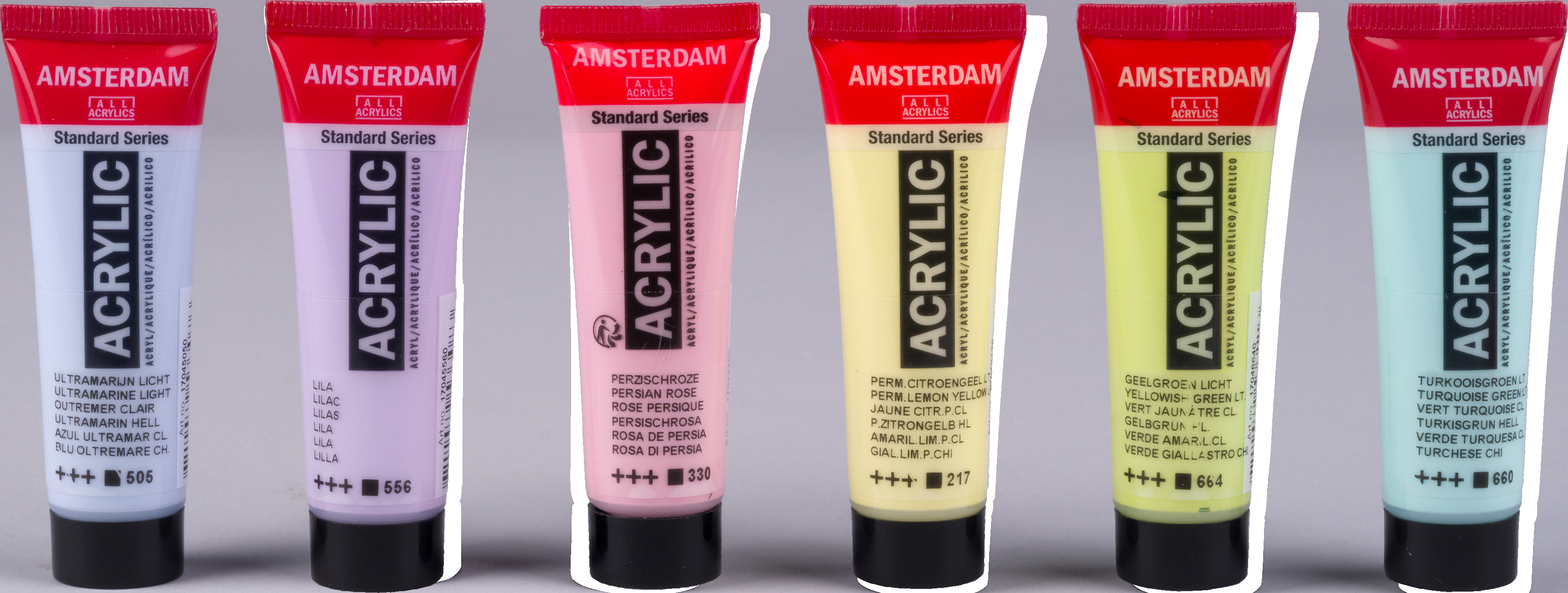 Inhalt: 6 x 20-ml-Tuben (505 Ultramarin hell – 556 Lila – 330 Persischrosa – 217 Permanentgelb hell – 664 Gelbgrün hell – 660 Türkisgrün hell).