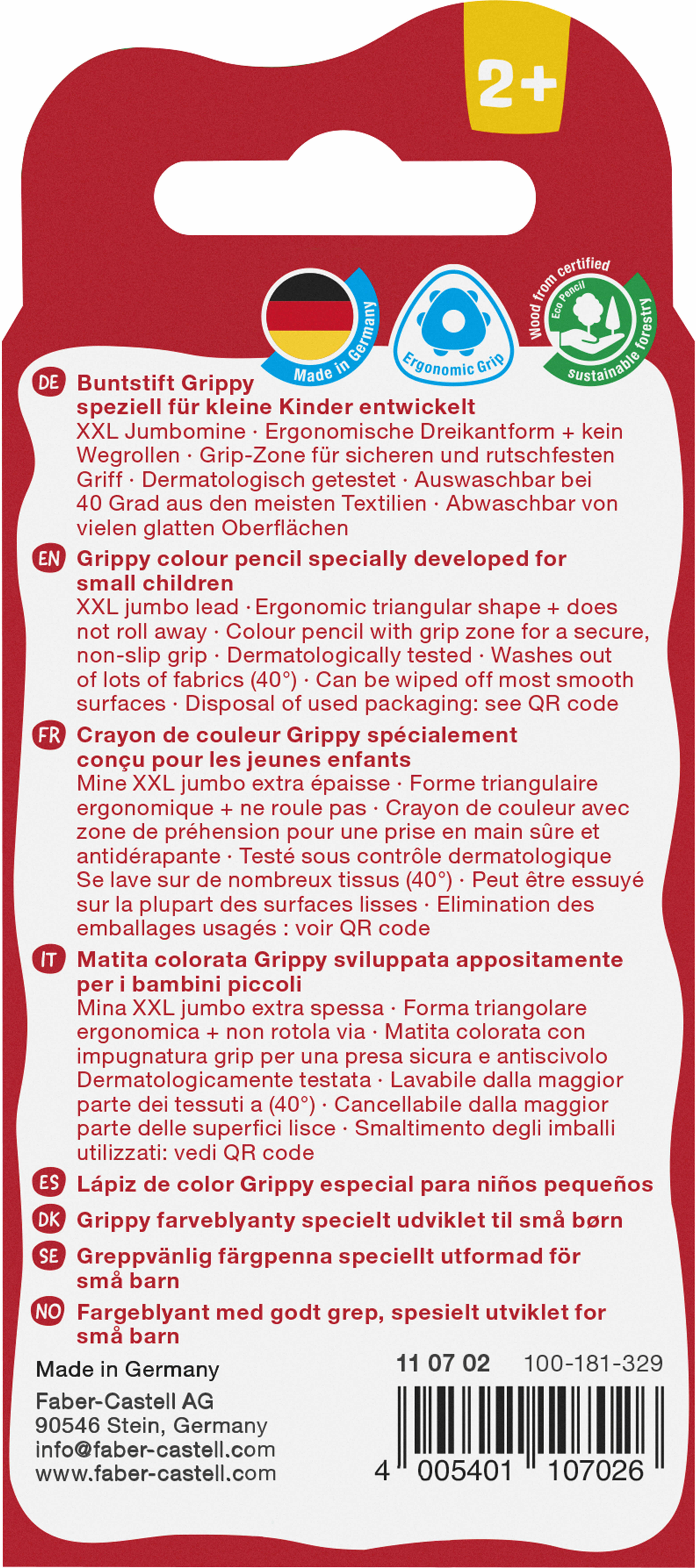 Der Hero für die Kleinsten. Buntstift mit weicher XXL Jumbomine - extra für kleine Kinderhände entwickelt. Vom Faust- und Pfötchengriff zum Dreifingergriff – dabei bietet der Grippy Kindern ab 2 Jahren sicheren Halt: mit kompaktem Schaft in ergonomischer Dreikantform und rutschfesten Noppen. Die wasservermalbaren, leuchtenden Farben der extra weichen und dicken Mine haften auf Papier, Karton und Glas. Sie sind dermatologisch getestet, leicht abwischbar von glatten Oberflächen und aus den meisten Textilien auswaschbar.