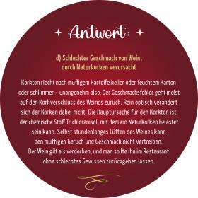 In Wein liegt die Wahrheit – der perfekte Adventsbegleiter für alle, die guten Wein lieben!Um Weinskandale, Rappern und Kirchenfenster dreht sich das witzige Quiz – herrlich unnützes, aber unterhaltsames Wissen für jeden Tag im Advent.Garantierter Rätselspass: 24 Fragen und Antworten rund um die Geschichte der edlen Tropfen, um Anbaugebiete, Herstellung, Sorten und Fun FactsSchön verstaut: In der attraktiven Geschenkdose sind die 24 runden Karten immer gut geschützt und stets einsatzbereit. Die hübsche Metalldose kann man wiederverwenden und als Geschenkverpackung nutzenTolle Geschenkidee: Ideales Mitbringsel für jede:n Weinschmecker:in: Freund, Schwester, Vater, Opa, Partnerin, Lieblingsmensch oder alle anderen, die sich eine kleine kulinarische Pause vom Weihnachtstrubel gönnen möchten.Na dann, Prost! Denn schon Goethe schrieb: Das Leben ist viel zu kurz um schlechten Wein zu trinken.