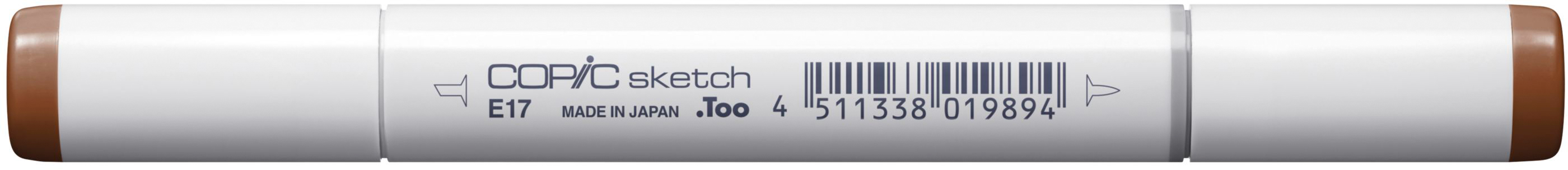 Copic Sketch Marker, E17. Professioneller Pinselmarker Copic Sketch in 358 Farben (+ neutralem Blender). Ausgestattet mit einer speziell entwickelten "Super Brush"-Spitze und einer "Medium Broad"-Spitze. (Spitzen austauschbar.) Ideal für Scribbles, Layouts, Storyboards, Illustrationen, Skizzen, Modedesigns und Kalligrafien. Auch im Hobbybereich für Comic- & Mangazeichnungen, Stempelkunst & Scrapbooking sowie für alle Anwender, die einem Pinselmarker den Vorzug geben. Der Copic Sketch ist einsteckbar in das Copic Airbrushing-Layoutsystem. Die Tinte ist identisch mit der des klassischen Copic Markers: Auf Alkoholbasis, toxikologisch unbedenklich und nahezu geruchlos. Sie trocknet schnell und verwischt nicht. Alle erhältlichen 358 Farben können mit Copic Ink farbidentisch wieder aufgefüllt werden. Mit einer einzigen Nachfüll-Flasche kann der Copic Sketch Marker 7 x wieder aufgefüllt werden. Das garantiert ein optimales Kosten-Nutzen-Verhältnis, ist umweltfreundlich und wirtschaftlich.