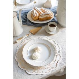 Die einseitigen Tischsets in elegantem Weiss mit goldenem Ornament verleihen jedem gedeckten Tisch eine festliche Atmosphäre und setzen edle Akzente bei besonderen Anlässen. Mit einem Durchmesser von etwa 35,5 cm bieten sie ausreichend Platz für Teller, Besteck und Dekorationen und eignen sich ideal für Geburtstage, Festlichkeiten oder stilvolle Buffets. Das Set umfasst 6 Tischsets und ist als Einwegprodukt konzipiert, sodass die Reinigung nach der Feier besonders unkompliziert bleibt. Gefertigt aus wasserfestem synthetischem Papier vereinen sie ansprechendes Design mit praktischer Funktionalität – eine elegante Lösung, um den Tisch im Handumdrehen aufzuwerten und ein harmonisches Gesamtbild zu schaffen.