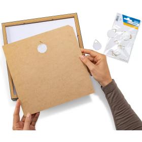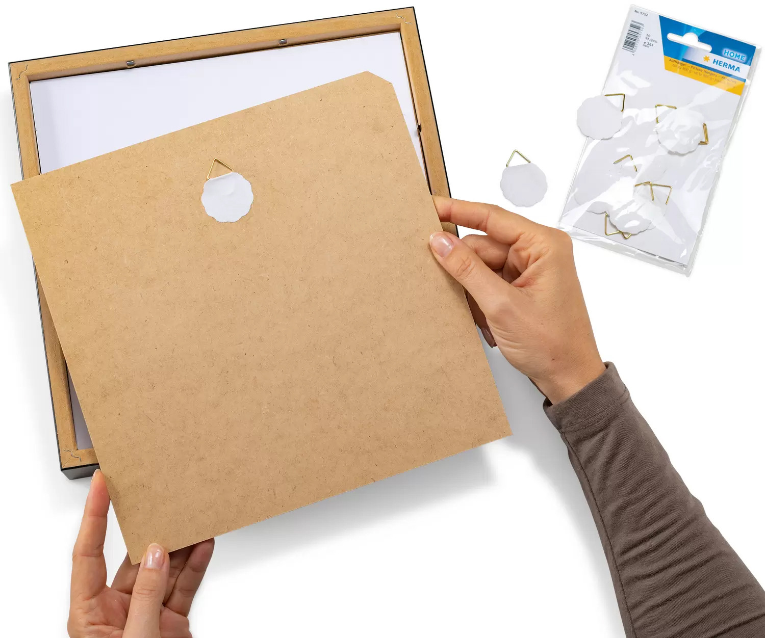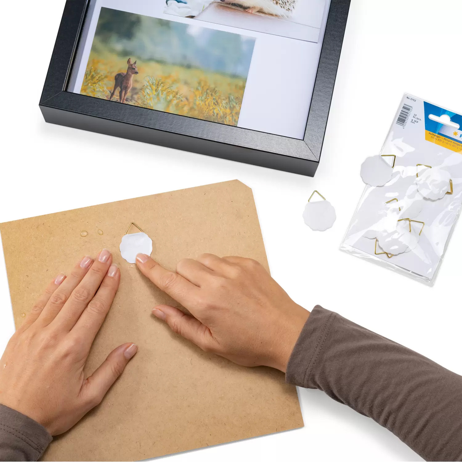 Die Aufhänger mit vermessingten Drahtbügeln sind wasserlöslich gummiert und zum Aufhängen von Bildern geeignet. Anwendung: Die Aufhänger auf der wasserlöslich gummierten Seite befeuchten und auf den Untergrund aufkleben. Etwa eine halbe Stunde unbelastet antrocknen lassen.