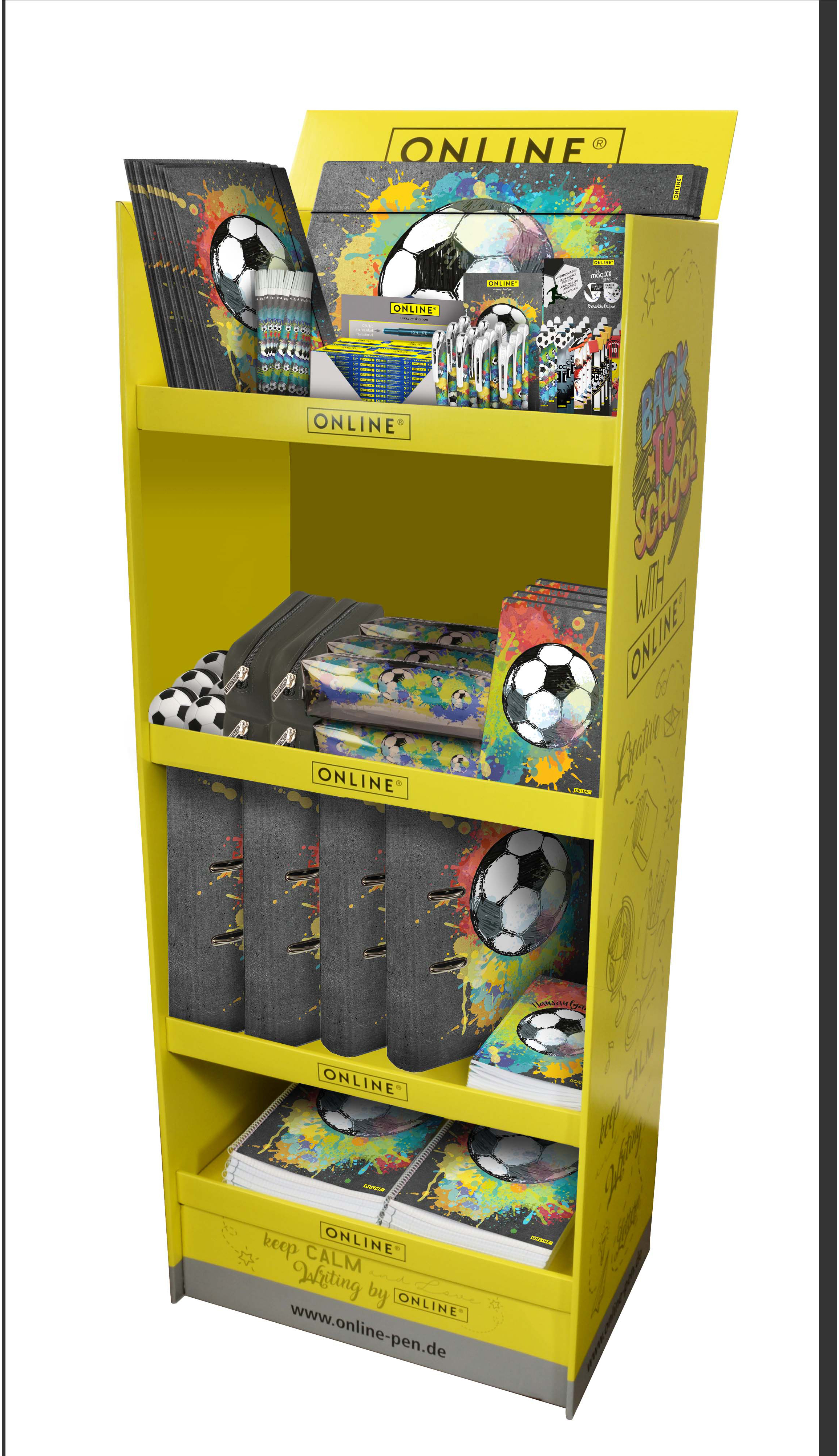 Cool, sportlich, angesagt – diese Serie bringt mit ihren starken Fussball-Designs jede Menge Bewegung ins Schuljahr. Verschiedene Artikel in Bodenaufsteller