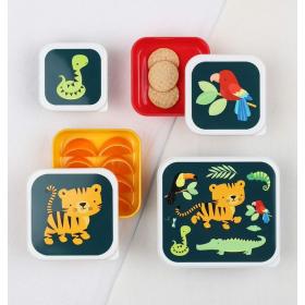 Set mit vier Lunch- und Snackboxen in verschiedenen Grössen und passenden Designs. Grossartig für die Schule, für unterwegs und ideal für die Aufbewahrung von Snacks zu Hause. Dank der Lasche an der Seite des Deckels lassen sie sich leicht öffnen und schliessen, und die Boxen lassen sich zur einfachen Aufbewahrung ineinander stapeln.