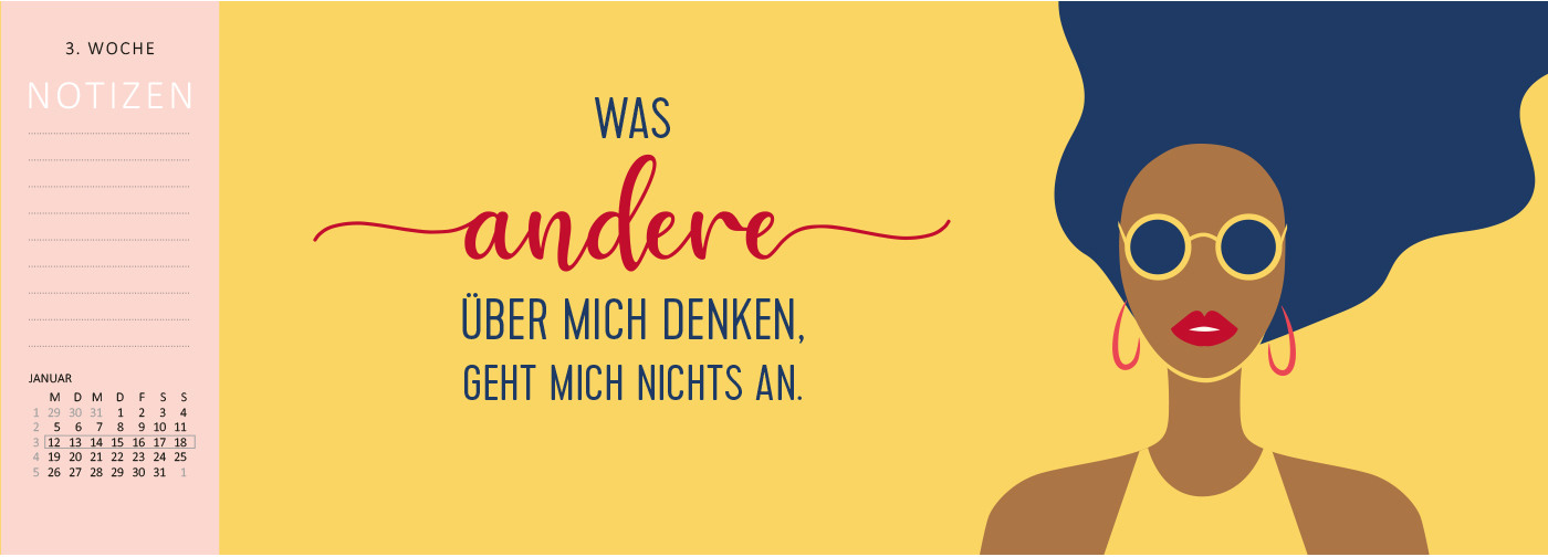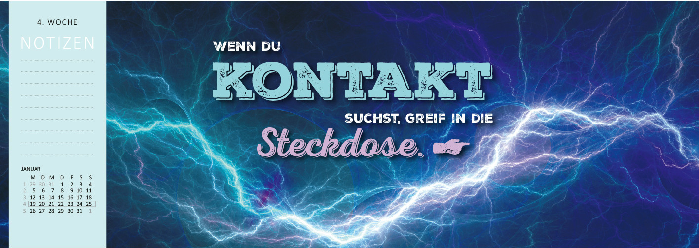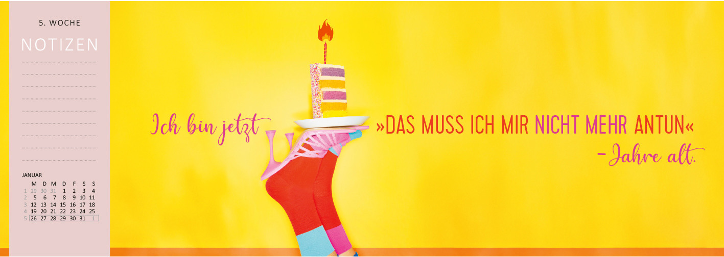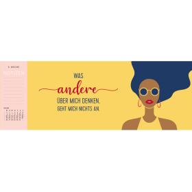 Der praktische Umlegekalender sorgt für das gewisse Etwas auf jedem Schreibtisch. Er bietet sofortigen Überblick über die Woche und ausreichend Platz für Notizen.