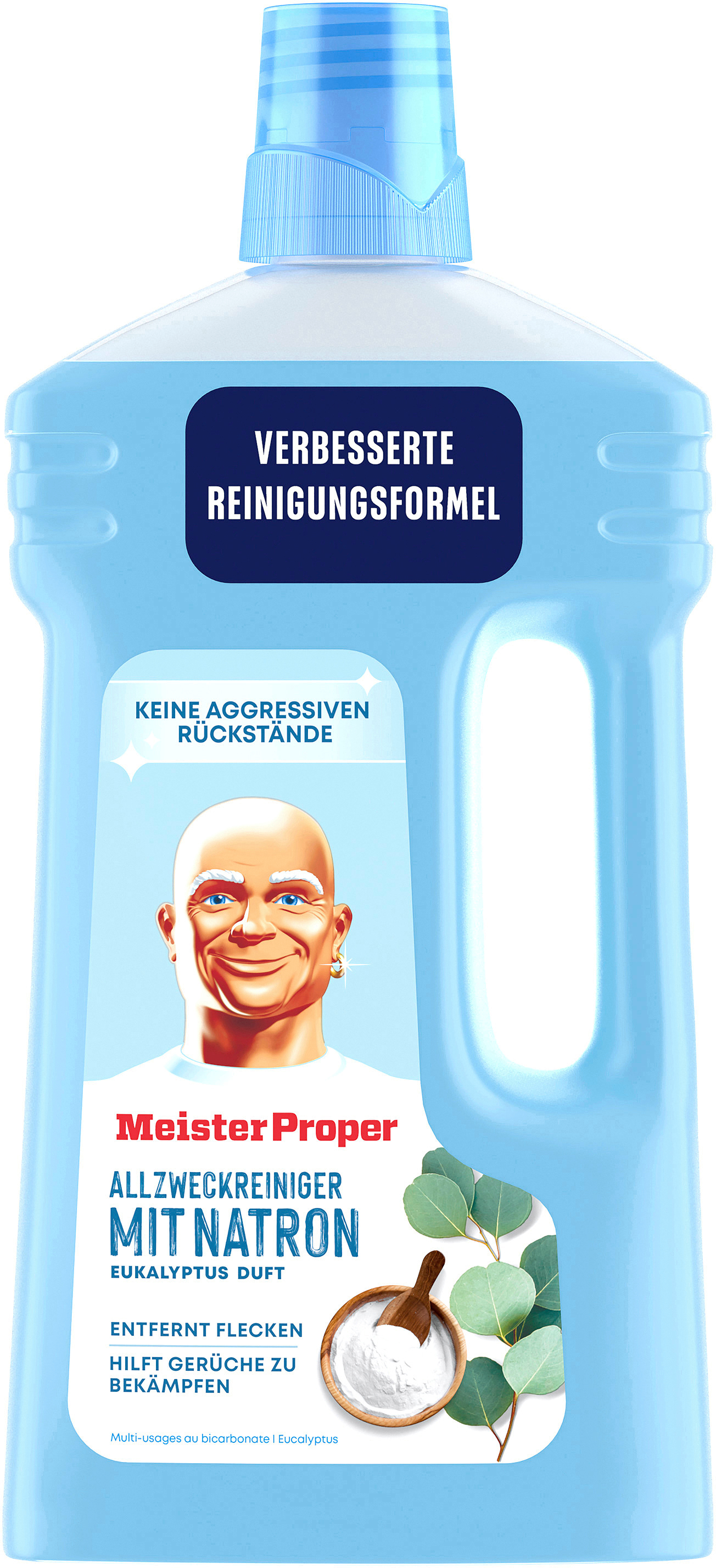 Meister Proper Allzweckreiniger eignet sich perfekt für die Reinigung fast aller glatten Oberflächen in Ihrem Zuhause. Er kombiniert die Reinigungskraft von Meister Proper mit der Verwendung authentischer Inhaltsstoffe. Sie können ihn für das Waschbecken, fettverschmutzte Herdplatten und sogar als Bodenreiniger verwenden. Er hinterlässt keine Streifen. Verleiht Ihrem Zuhause einen angenehmen Duft von Natron und Eukalyptus.