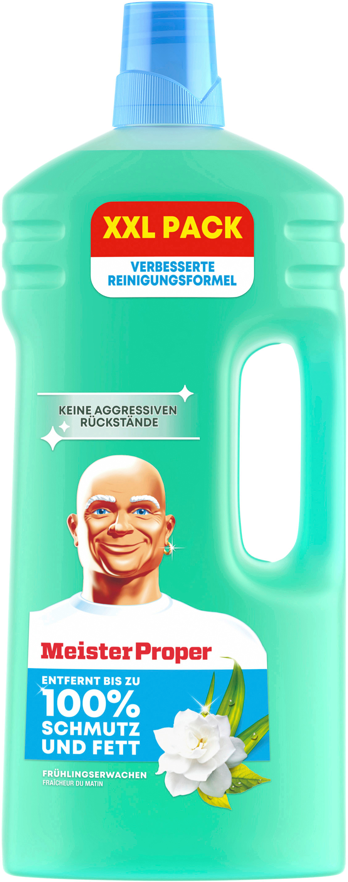 Meister Proper Allzweckreiniger eignet sich ideal für fast alle glatten Oberflächen. Sie können es für das Spülbecken, fettverschmutzte Herdplatten und als Bodenreiniger verwenden. Das flüssige Meister Proper entfernt bis zu 100% Schmutz und Fett ohne Streifen zu hinterlassen. Entdecken Sie unseren besten Glanz aller Zeiten. Verleihen Sie Ihrem Zuhause einen frischen Duft Citrusfrische dank seines entzückenden Aromas.