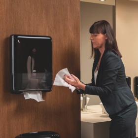 Tork PeakServe: die neueste Innovation für hochfrequentierte Waschräume, in denen das Reinigungspersonal mehr Reinigungsaufwand hat und für einen reibungslosen Besucherdurchlauf sorgen muss. Kompatibel mit dem Tork PeakServe System für Endlos-Handtücher. Das System verfügt über eine sehr hohe Kapazität von 1.230 Handtüchern, die schnell und ohne Unterbrechung ausgegeben werden und so einen schnellen und reibungslosen Besucherdurchlauf ermöglichen. Die komprimierten Nachfüllungen sind schnell einzulegen, können jederzeit aufgefüllt werden und sind einfach und bequem zu transportieren und zu lagern – damit sich Ihr Personal ganz auf das Reinigen konzentrieren kann.
