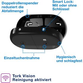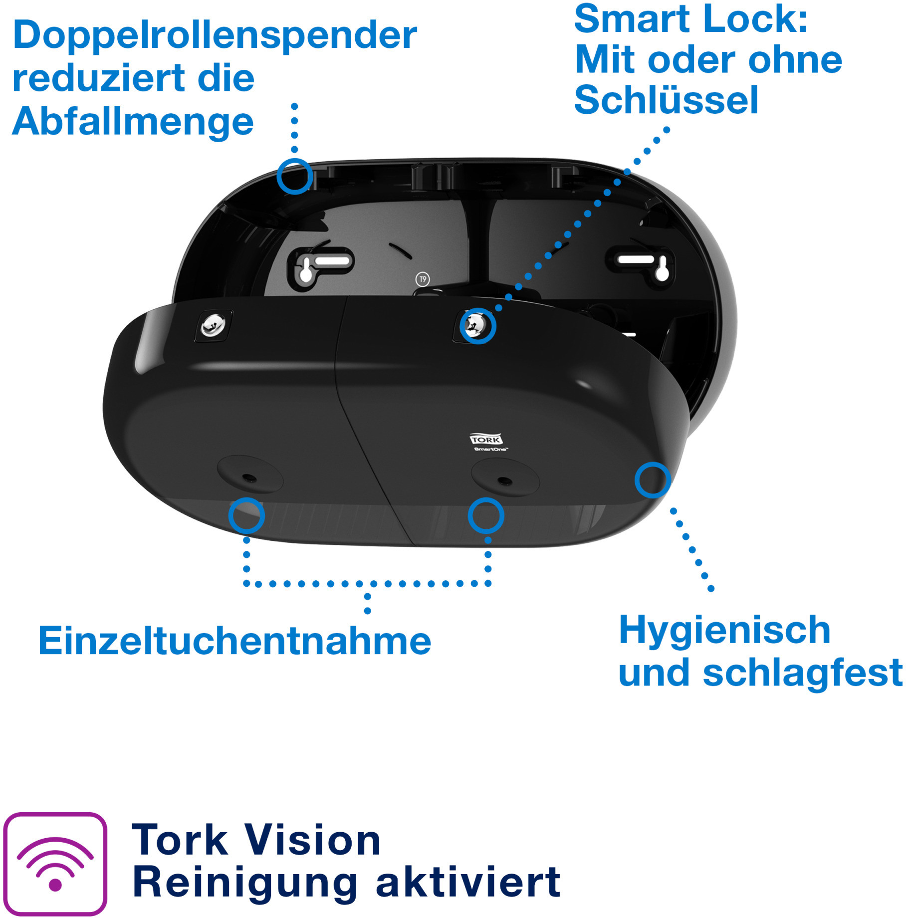 Der Tork SmartOne® Mini Doppelrollenspender für Toilettenpapier mit Elevation-Design ist ein modernes und effizientes Spendersystem für anspruchsvolle Waschräume mit hoher Besucherfrequenz. Durch die Doppelrollen und die Einzeltuchentnahme wird der Verbrauch im Vergleich zu herkömmlichen Spendern für Jumbo Toilettenpapier um bis zu 40 % gesenkt, sodass pro Rolle mehr Toilettengänge möglich sind. Tork Elevation Spender zeichnen sich durch ein modernes, funktionales Design aus, das bei Gästen einen guten Eindruck macht.