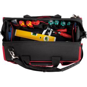 Rund 33 Werkzeuge finden Platz und können so einfach und bequem von Arbeitseinsatz zu Arbeitseinsatz transportiert werden. Für Ordnung sorgen dabei neben einem grosszügigen Hauptfach rund acht Einsteckfächer, acht Gummischlaufen sowie zwei weitere grosse Staufächer im Tascheninneren. Sieben weitere aussenliegende Fächer, zwei davon verschliessbar, sowie ein Massbandhalter aus Metall, ein Einschub für ein Adressetikett, als auch zwei Zurrschleifen für eine Wasserwaage halten zudem weiteres Arbeitsequipment sicher und ordentlich verstaut und schnell griffbereit. Taschenboden kunststoffverstärkt. Integrierte Bodengleiter schützen zudem Arbeitsuntergründe und die Tasche selbst vor Beschädigungen.