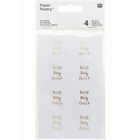 Gestalten Sie Hochzeitskarten oder Gesangshefte sowie Tisch- oder Einladungskarten mit den Stickern „Best Day Ever“. Der goldene Schriftzug auf dem weißen Hintergrund passt ideal zu jeder Tischdeko. Sie erhalten auf 4 Blättern jeweils acht Sticker.