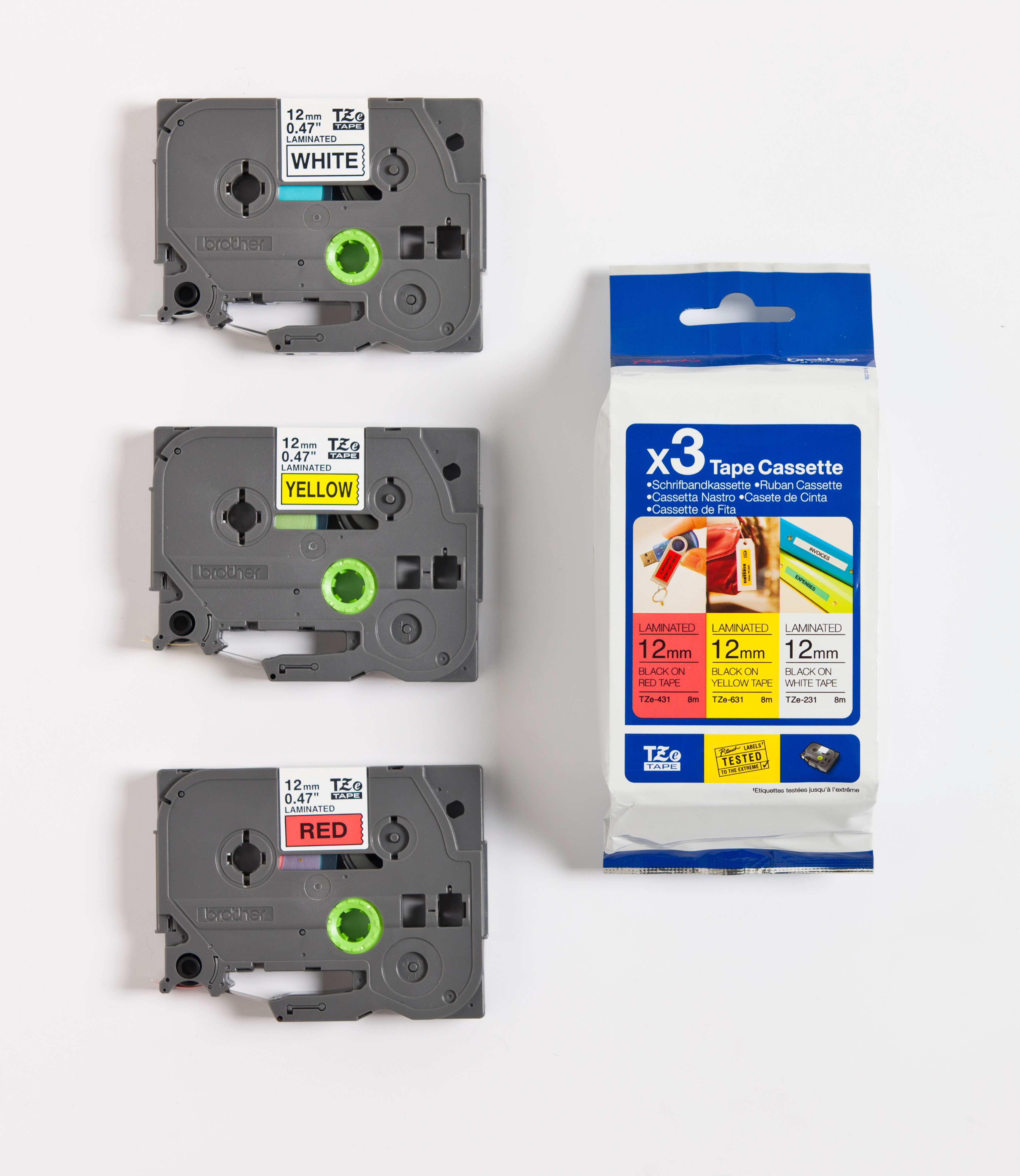 Das Original Brother TZe-31M3 Schriftband-Multipack beinhaltet drei laminierte Schriftbänder in unterschiedlichen Farben. Mit den jeweiligen Schriftbandkassetten drucken Sie klare, gestochen scharfe und perfekt lesbare Etiketten. Dank der Laminierung durch den patentierten Hinterbanddruck halten die selbstklebenden Etiketten dabei nicht nur extremen Temperaturen stand, sondern sind zudem UV-beständig, wasserfest und vor Abrieb und Chemikalien geschützt. Dadurch sind sie sowohl für den Innen- und Aussenbereich als auch für die Industrie geeignet.