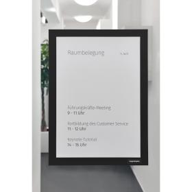Aufklappbarer, doppelseitiger Inforahmen in 6 stylischen Farben, 2 Stück. Rückt Dokumente, Bilder + Fotos optimal ins Blickfeld + verleiht ihnen den angemessenen Rahmen. Auch für betriebliche Informationen in Büro, Lager + Fertigung sowie für TQM-Infotafeln geeignet. Rückseite selbstklebend, so dass der Info-Rahmen auf allen glatten Oberflächen wie Metall, Fliesen, Kunststoff, Feinputz etc. sicher haftet. Auf Glas sind Rahmen und Dokumente sogar doppelseitig sichtbar, wenn Vorder- und Rückseite bestückt werden. Flexibel nutzbar, um Dokumente regelmäßig auszuwechseln. Im Hoch und Querformat einsetzbar. Dokumentenwechsel durch umlaufenden Magnetverschluss schnell + einfach möglich: Eine Ecke anheben - Dokument wechseln - Ecke loslassen - FERTIG! Packung mit 2 selbstklebenden Info-Rahmen. Haftet an allen glatten Oberflächen. Flexibel nutzbar, Material: Polypropylen (PP). REACH-konform.