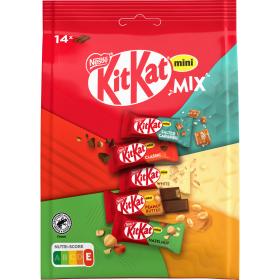 Mischung aus Knusperwaffeln mit verschiedenen Füllungen in Milchschokolade oder weisser Fettglasur. Du hast Lust auf mehr KitKat-Vielfalt? Probiere unbedingt den KitKat Mini Mix aus – Du wirst ihn lieben! Fünf leckere Geschmacksrichtungen im Mini Mix-Beutel bringen Abwechslung in Deinen persönlichen Pausenmoment - ganz nach Lust und Laune: - Hazelnut: Mit knackigen Haselnussstückchen - Peanut Butter: Mit leckerer Erdnussbutter-Füllung - Salted Caramel: Mit feinem gesalzenem Karamell - White: Mit unwiderstehlicher weißer Schokolade - Classic: Mit zartschmelzender Milchschokolade. Mix it up!