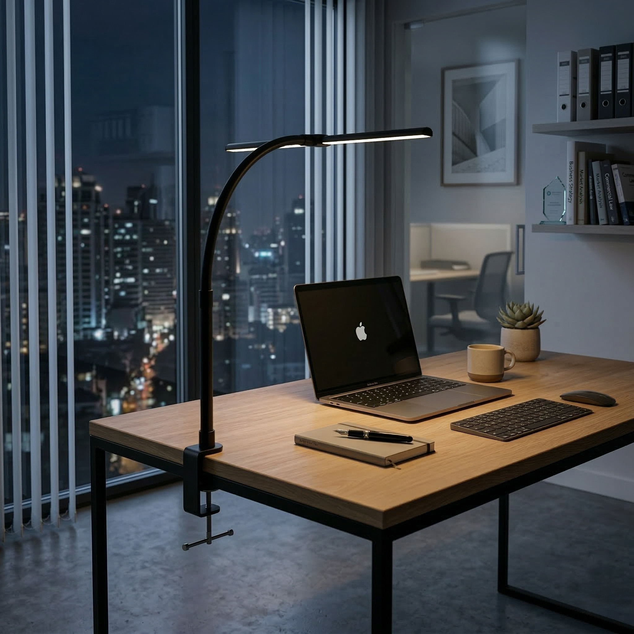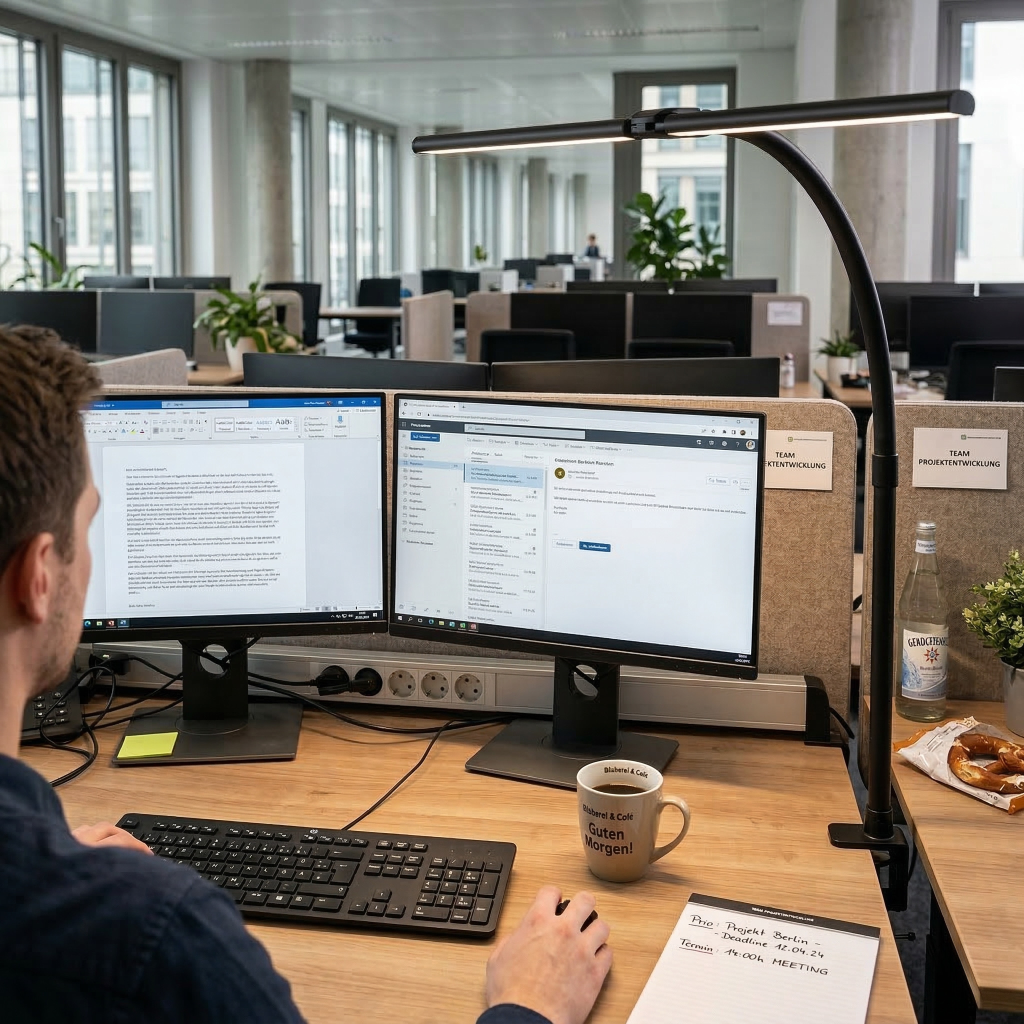 Die Luxula Schreibtischlampe mit Doppelkopf-Design bietet eine extra breite Ausleuchtung von 80 cm - ideal für grosse Schreibtische, Arbeitsflächen oder Monitor-Setups. Mit einer Lichtleistung von 800 Lumen sorgt sie für eine gleichmässige Helligkeit ohne Flimmern - perfekt für langes Arbeiten, Lesen oder kreative Projekte. Ein hoher Farbwiedergabeindex (CRI 85) und ein grosszügiger 120° Abstrahlwinkel garantieren eine angenehme, augenschonende Beleuchtung. Ideal für lange Arbeitstage - reduziert Ermüdung und unterstützt die Konzentration. Fünf Farbtemperaturen von warmweiss bis kaltweiss sowie eine stufenlose Dimmfunktion machen diese Lampe zum flexiblen Lichtpartner - ob zum Arbeiten, Lesen oder Entspannen. Der robuste Clip sorgt für festen Halt an Tischplatten - ganz ohne Bohren. Der biegsame Schwanenhals lässt sich individuell ausrichten und bringt das Licht genau dahin, wo Sie es brauchen. Das moderne, schlanke Design in klassischem Schwarz fügt sich dezent in jede Umgebung ein - vom professionellen Büro über das Homeoffice bis hin zur Lese-Ecke oder der Uni-Arbeitsstation.