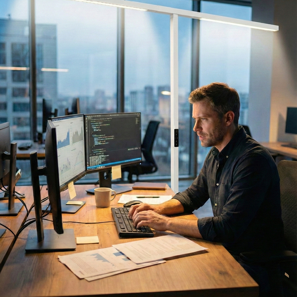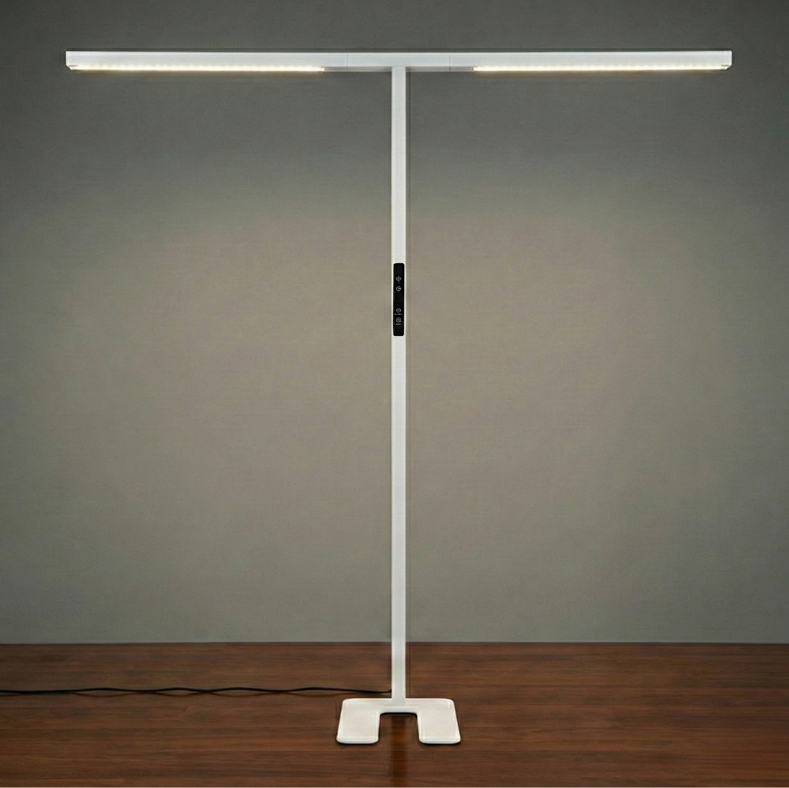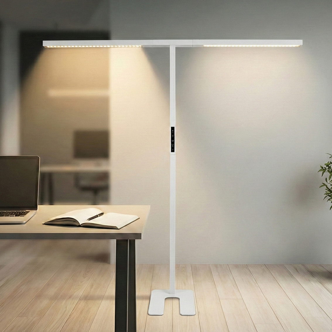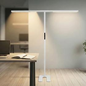 Die LED-Büro-Stehleuchte Slim Line, Duo von Luxula bietet eine innovative Beleuchtungslösung für moderne Arbeitsumgebungen. Mit einer Gesamtleistung von 90 Watt und einer beeindruckenden Lichtstärke von 5000 Lumen sorgt sie für eine blendfreie Ausleuchtung (UGR<16), die das Arbeiten angenehm und produktiv gestaltet. Die herausragende Farbwiedergabe mit einem CRI von 98 ermöglicht eine natürliche Darstellung von Farben und Materialien, was besonders für präzise Arbeiten von Vorteil ist. Die intuitive Touchsteuerung erlaubt eine einfache Anpassung der Lichtintensität und die getrennte Steuerung von Up- und Downlight sorgt für eine flexible Lichtgestaltung. Das neutrale Licht mit 4000 Kelvin fördert die Konzentration und schafft eine professionelle Atmosphäre. Die robuste Konstruktion aus Aluminium und Eisen gewährleistet eine gleichmässige Lichtverteilung und Langlebigkeit im täglichen Einsatz.