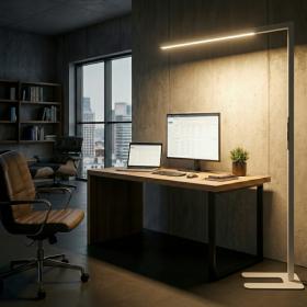 Die LED-Büro-Stehleuchte Slim Line von Luxula bietet eine innovative Beleuchtungslösung für moderne Arbeitsumgebungen. Mit einer Gesamtleistung von 90 Watt und einer beeindruckenden Lichtstärke von 3500 Lumen sorgt sie für eine blendfreie Ausleuchtung (UGR<16), die das Arbeiten angenehm und produktiv gestaltet. Die herausragende Farbwiedergabe mit einem CRI von 98 ermöglicht eine natürliche Darstellung von Farben und Materialien, was besonders für präzise Arbeiten von Vorteil ist. Die intuitive Touchsteuerung erlaubt eine einfache Anpassung der Lichtintensität und die getrennte Steuerung von Up- und Downlight sorgt für eine flexible Lichtgestaltung. Das neutrale Licht mit 4000 Kelvin fördert die Konzentration und schafft eine professionelle Atmosphäre. Die robuste Konstruktion aus Aluminium und Eisen gewährleistet eine gleichmässige Lichtverteilung und Langlebigkeit im täglichen Einsatz.