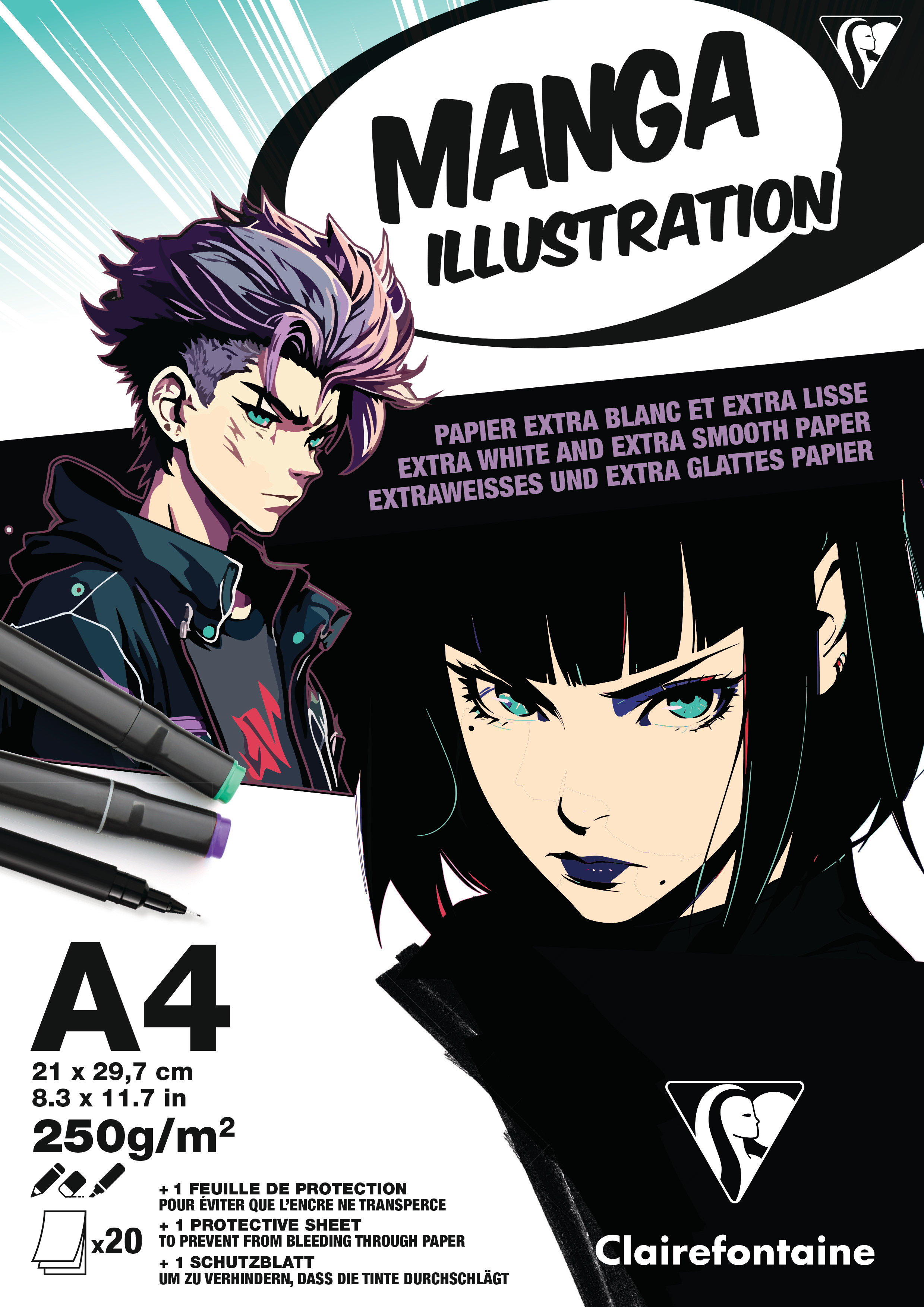 Manga Illustration, Block A4 geleimt, 20 Blatt 250g, extraweiß Extraweißes, glattes Bristolpapier aus 100% Zellulose. Die Grammatur von 250g ist ideal für Mangazeichnungen mit Bleistift, Buntstift, Feder, Tinte oder Filzstift. Dank des Schutzblattes schlagen die Alkoholmarker nicht auf das nächste Blatt durch, so dass die Seiten perfekt weiß bleiben, ohne Spuren von Alkoholtinte. Sehr widerstandsfähig: Es lassen sich Korrekturen an Zeichnungen durch Schaben oder Radieren auf dem Papier ausführen. Säurefrei und pH-neutral.