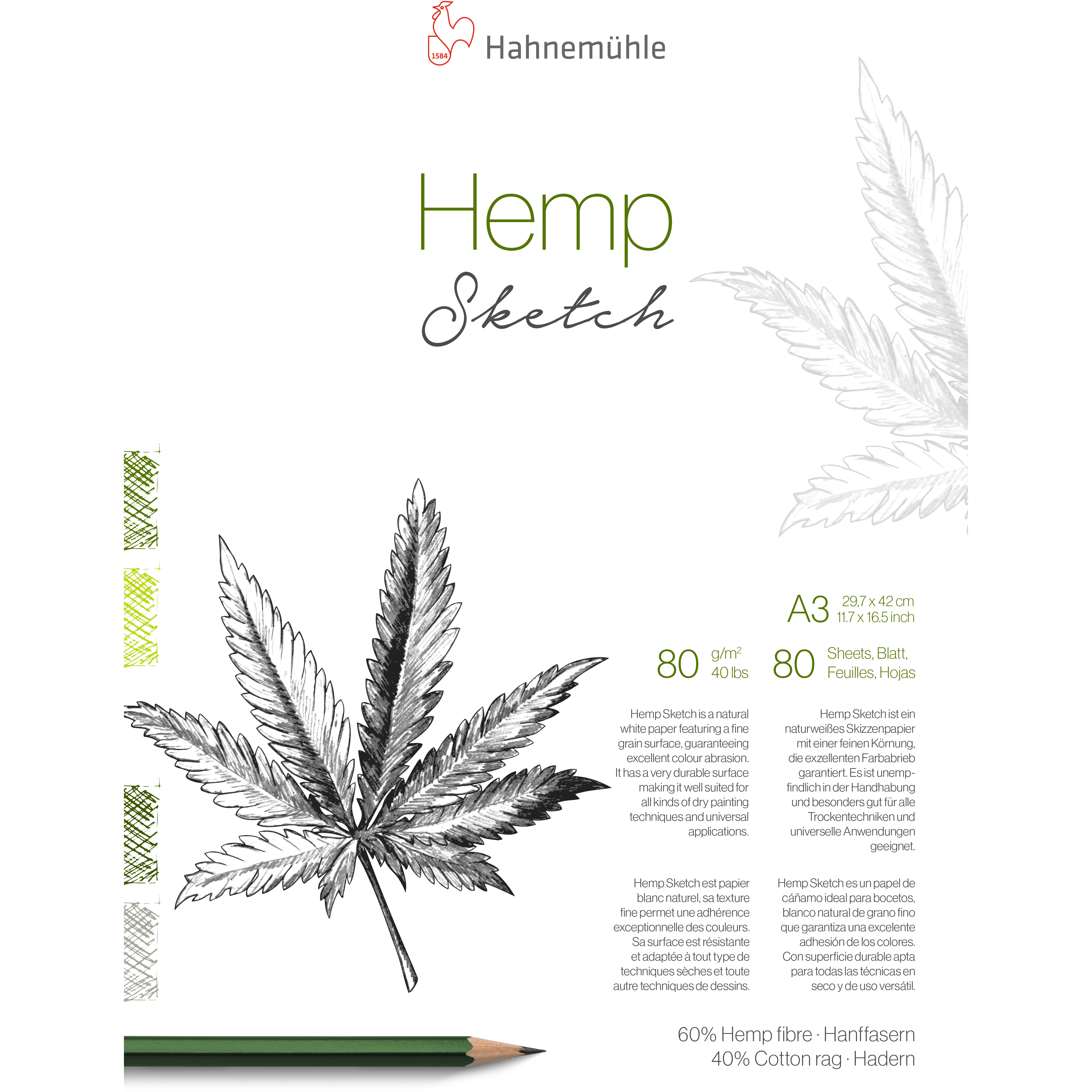 Der Hemp Sketch Block aus der Natural Line von Hahnemühle wird aus nachhaltigem Hanfpapier hergestellt und steht für umweltfreundliche Papierproduktion. Mit einem Flächengewicht von 80 g/m² eignet sich das Papier ideal für Skizzen, Zeichnungen und Bleistiftarbeiten. Die naturbelassene, leicht strukturierte Oberfläche garantiert eine angenehme Haptik und gleichmässige Ergebnisse.