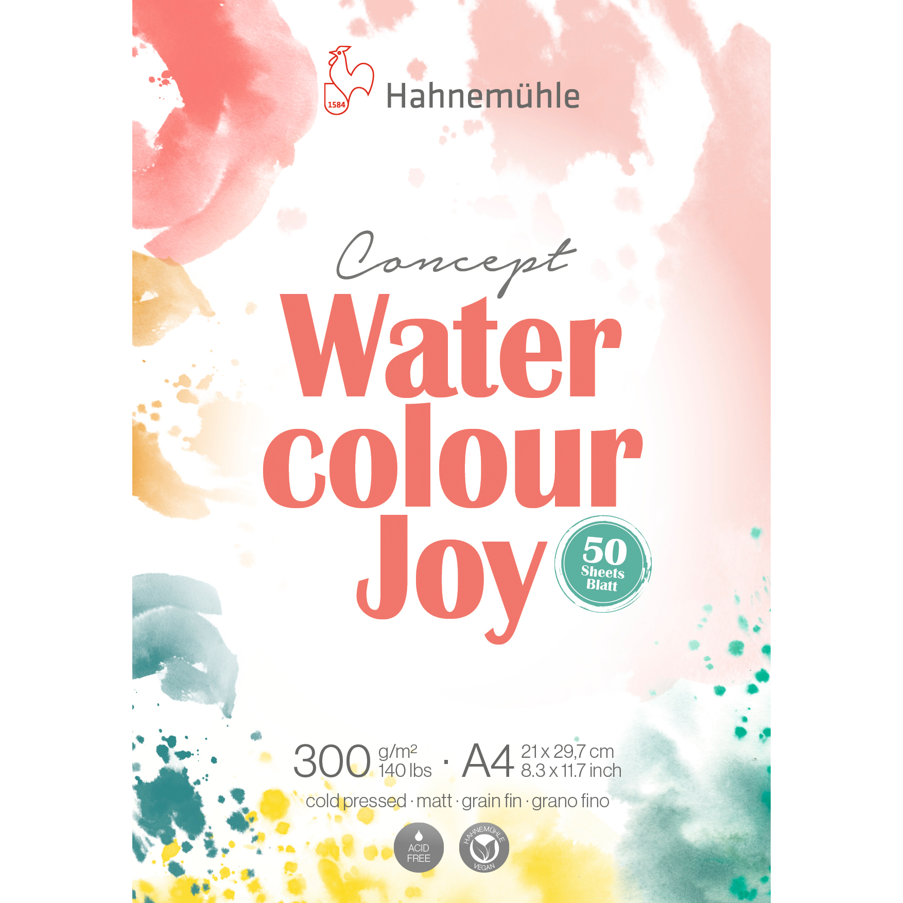 Der Concept Watercolour Joy Block von Hahnemühle wird aus hochwertigen Materialien hergestellt und steht für eine Papierproduktion mit besonderer Qualität. Mit einem Flächengewicht von 300 g/m² eignet sich das Papier ideal für Aquarellmalerei, Gouache und andere Nassmaltechniken. Die matte, fein strukturierte Oberfläche sorgt für eine gleichmässige Farbaufnahme und brillante Ergebnisse.