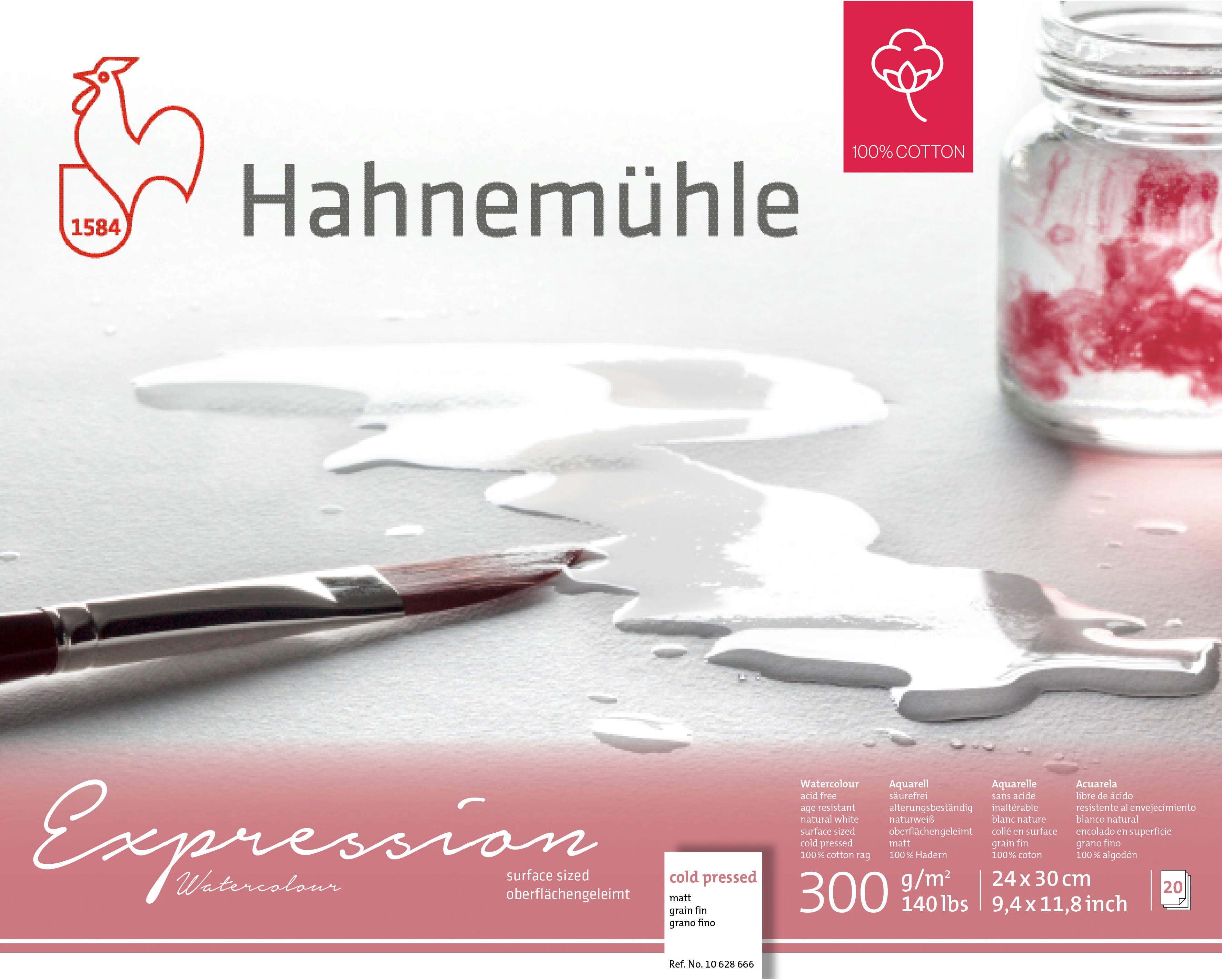 Die Expression Aquarellblöcke von Hahnemühle vereinen hochwertige Papierqualität mit grosser Vielseitigkeit für Aquarell-, Gouache- und Mixed Media Techniken. Mit 300 g/m² sind die Blätter stabil genug für intensive Nassmaltechniken, und die matte, fein strukturierte Oberfläche garantiert eine gleichmässige Farbaufnahme und brillante Ergebnisse. Erhältlich in mehreren Formaten, eignen sich die Blöcke sowohl für detaillierte Arbeiten im Atelier als auch für kreative Projekte unterwegs.