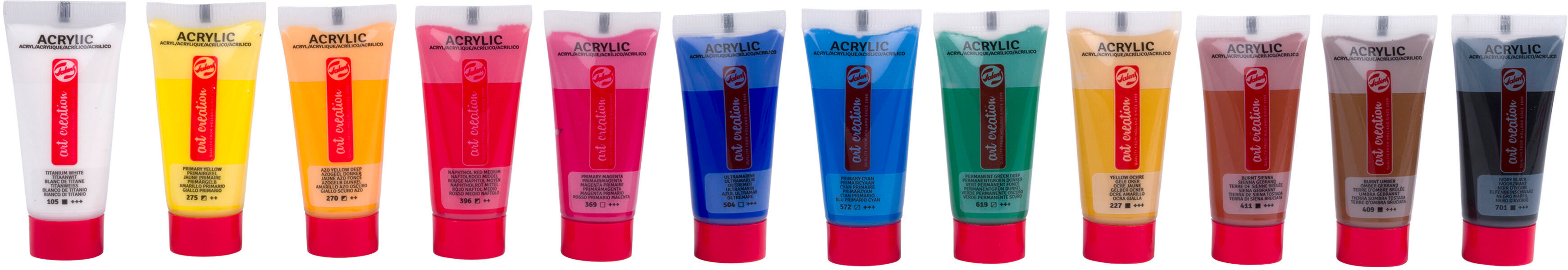 • Talens Art Creation Acrylfarbe ist eine zuverlässige Qualitäts-Acrylfarbe auf Acrylharzbasis. Die Farbe hat eine pastose Konsistenz, trocknet schnell und hat nach dem Trocknen einen seidigen Glanz. Diese Acrylfarben können direkt aus der Tube oder mit Wasser verdünnt verwendet werden und sind nach dem Trocknen wasserfest. Die Farben lassen sich leicht miteinander mischen und sind dank der Dosierkappe einfach zu verwenden.