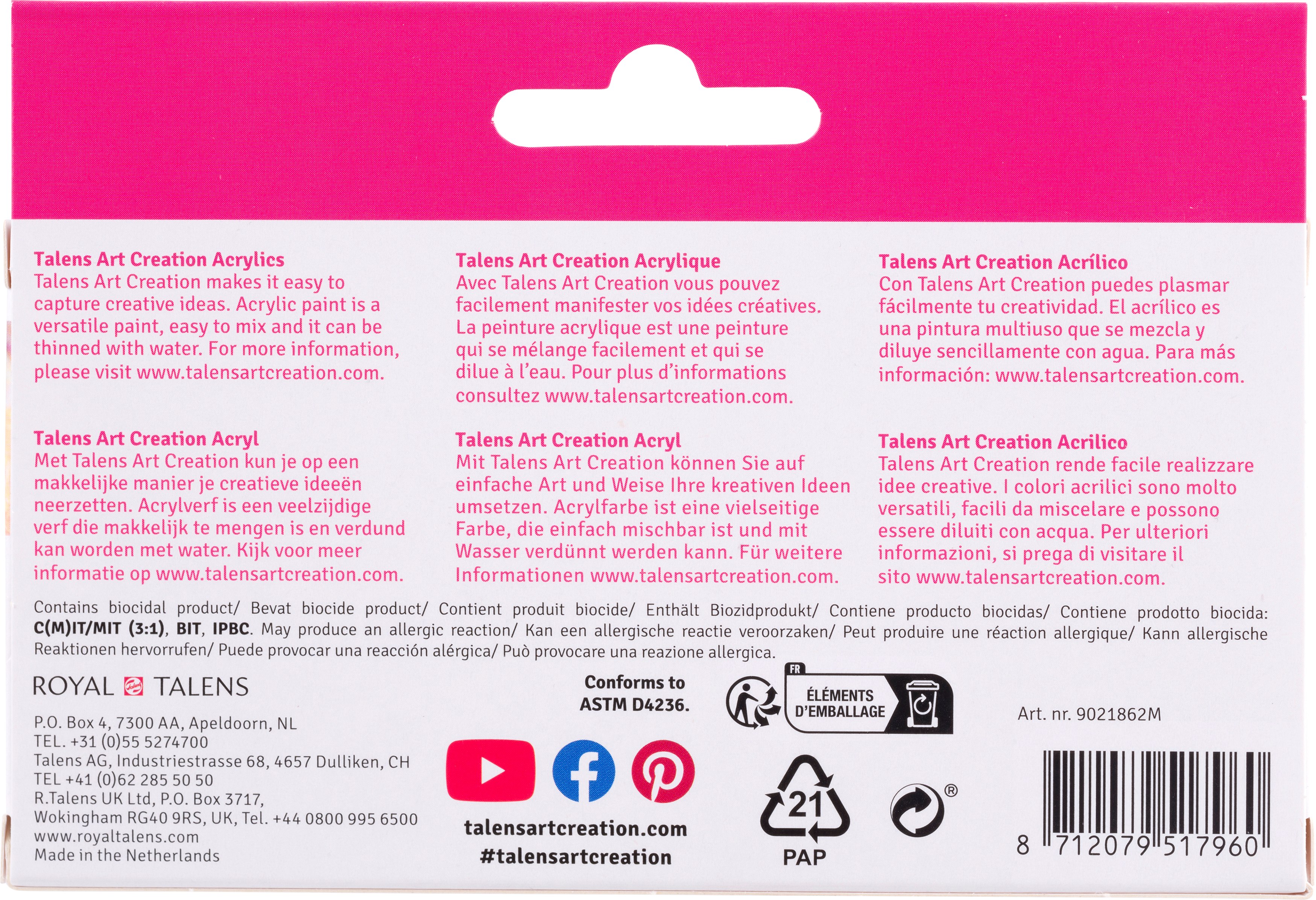 - Talens Art Creation Acrylfarbe ist eine zuverlässige Qualitäts-Acrylfarbe auf Acrylharzbasis. Die Farbe hat eine pastose Konsistenz, trocknet schnell und hat nach dem Trocknen einen seidigen Glanz. Diese Acrylfarben können direkt aus der Tube oder mit Wasser verdünnt verwendet werden und sind nach dem Trocknen wasserfest. Die Farben lassen sich leicht miteinander mischen und sind dank der Dosierkappe einfach zu verwenden.