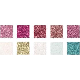 Mit ihrer funkelnden Glitteroberfläche sind die Papiere dieses Papierblocks perfekt für attraktive Bastelprojekte geeignet. Basteln Sie beispielsweise Karten oder glitzernde Wanddekorationen. Auch mit Motivstanzern lassen sich die Papiere bearbeiten. Der Block enthält 10 Papiere in 10 verschiedenen farbharmonischen Farben. Die Rückseite ist weiss.