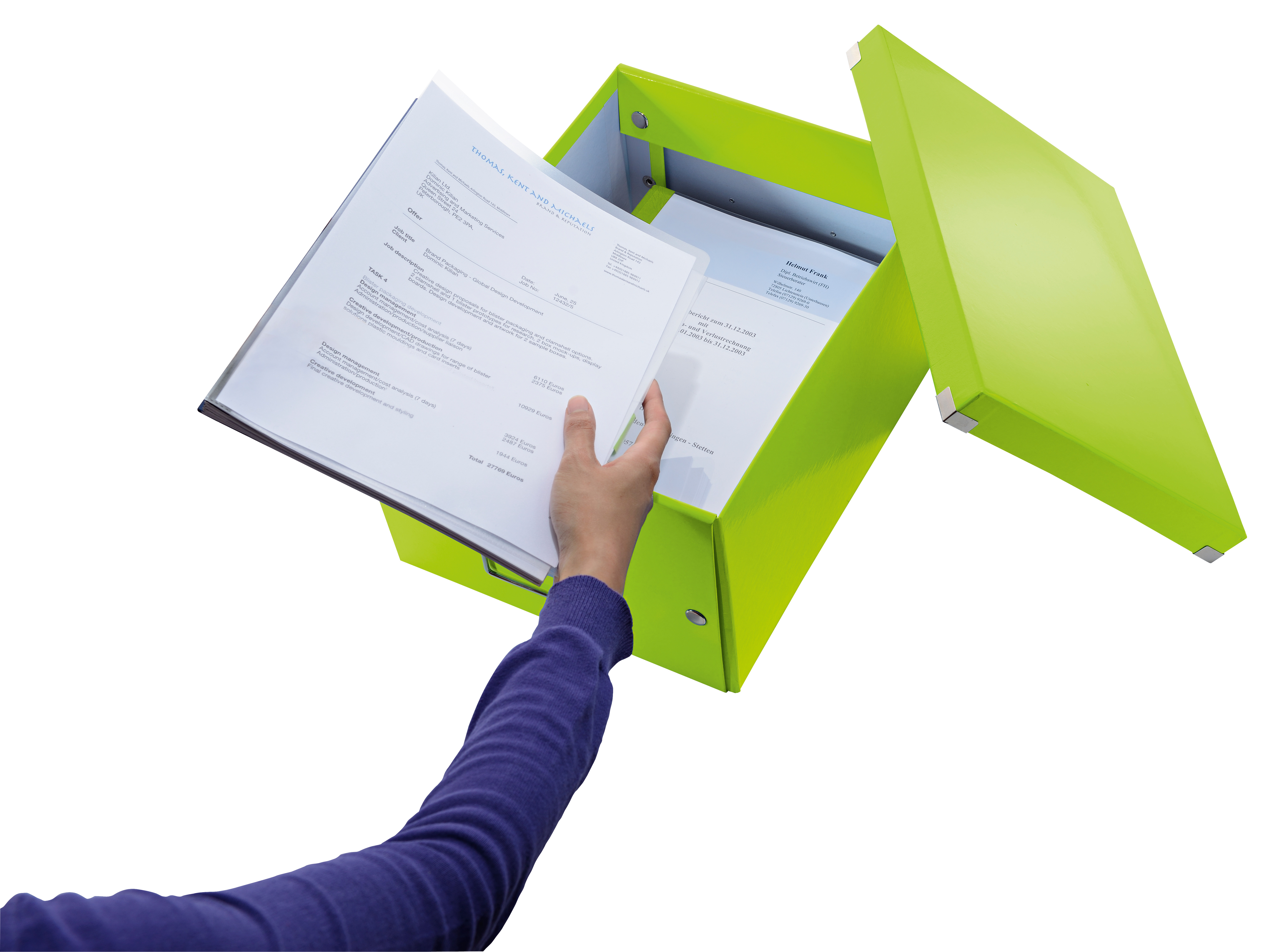 Mittlere Aufbewahrungs- und Transportbox für Unterlagen in Format A4 mit laminierter Oberfläche und metallverstärkten Ecken für einen dauerhaften Schutz. Aus robuster Premium-Hartpappe. Leichtes Aufbauen dank praktischer Druckknöpfe und ebenso schnelles Zusammenklappen zum platzsparenden Verstauen. Modernes und zeitgemässes Design für Zuhause oder fürs Büro.