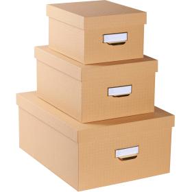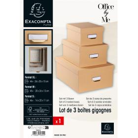 Set mit 3 Boxen, OfficeByMe ist Exacomptas erste plastikfreie Serie von Büroaccessoires, die vollständig aus FSC®-zertifiziertem Karton und Papier hergestellt werden. Die Produkte werden aus Recyclingkarton hergestellt, der mit einem Papier mit Textileffekt überzogen ist, einem pflanzlichen Monomaterial, das das Recycling erleichtert. Set mit 3 ineinander stapelbaren Boxen: Großes Format: 26x35x15cm - A4+ Format für Akten und Mappen mit Gummizug. Mittleres Format: 20x26x13cm - Format A5++ für Accessoires, Notizbücher, Nituzhefte etc. Kleines Format: 16x20x11cm - Format A6++ für die Ablage von kleinen Accessoires. Der Etikettenhalter ist mit einem Rand versehen, um ihn besser greifen zu können. Das beidseitige Etikett ermöglicht die Kennzeichnung des Inhalts. Hochfester Karton 3mm. Innen Papier mit Logo ohne Plastik.