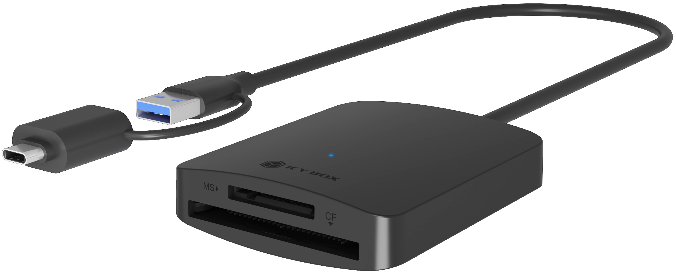 Der flexible 4-in-1 Kartenleser für alle Fälle. Der IB-CR302-CU3 ist die kompakte und zuverlässige Lösung für den schnellen Zugriff auf Ihre Speicherkarten – ganz gleich, ob im Büro, unterwegs oder im kreativen Einsatz. Ausgestattet mit einem integrierten USB 3.2 Gen 1 Type-A Kabel und einem zusätzlichen USB Type-C® Adapter verbindet sich der Kartenleser problemlos mit nahezu jedem modernen Gerät – ganz ohne zusätzliches Zubehör. Dank Multi-Karten-Kompatibilität liest und beschreibt der IB-CR302-CU3 eine Vielzahl von Formaten, darunter SD, Micro SD, MS, MS Pro Duo und Compact Flash – mit Speicherkapazitäten von bis zu 2 TB. Ideal für Fotografen, Kreative oder alle, die täglich mit grossen Datenmengen arbeiten. Sein kompaktes Format (nur 67,98 x 56,98 x 15,6 mm) macht ihn zum idealen Begleiter für unterwegs – robust genug für den Dauereinsatz, klein genug für jede Tasche. Das integrierte 500-mm-Kabel sorgt für Ordnung am Arbeitsplatz und stellt sicher, dass die passende Verbindung immer dabei ist – kein Kabelsalat, kein Adapterchaos. Der Kartenleser ist kompatibel mit Windows®, macOS® und Linux® und bietet damit einen plattformübergreifenden Zugriff auf Ihre Medien. Ob für Backups, Datenimporte oder professionelle Medienbearbeitung – mit dem IB-CR302-CU3 sind Sie bestens ausgestattet.