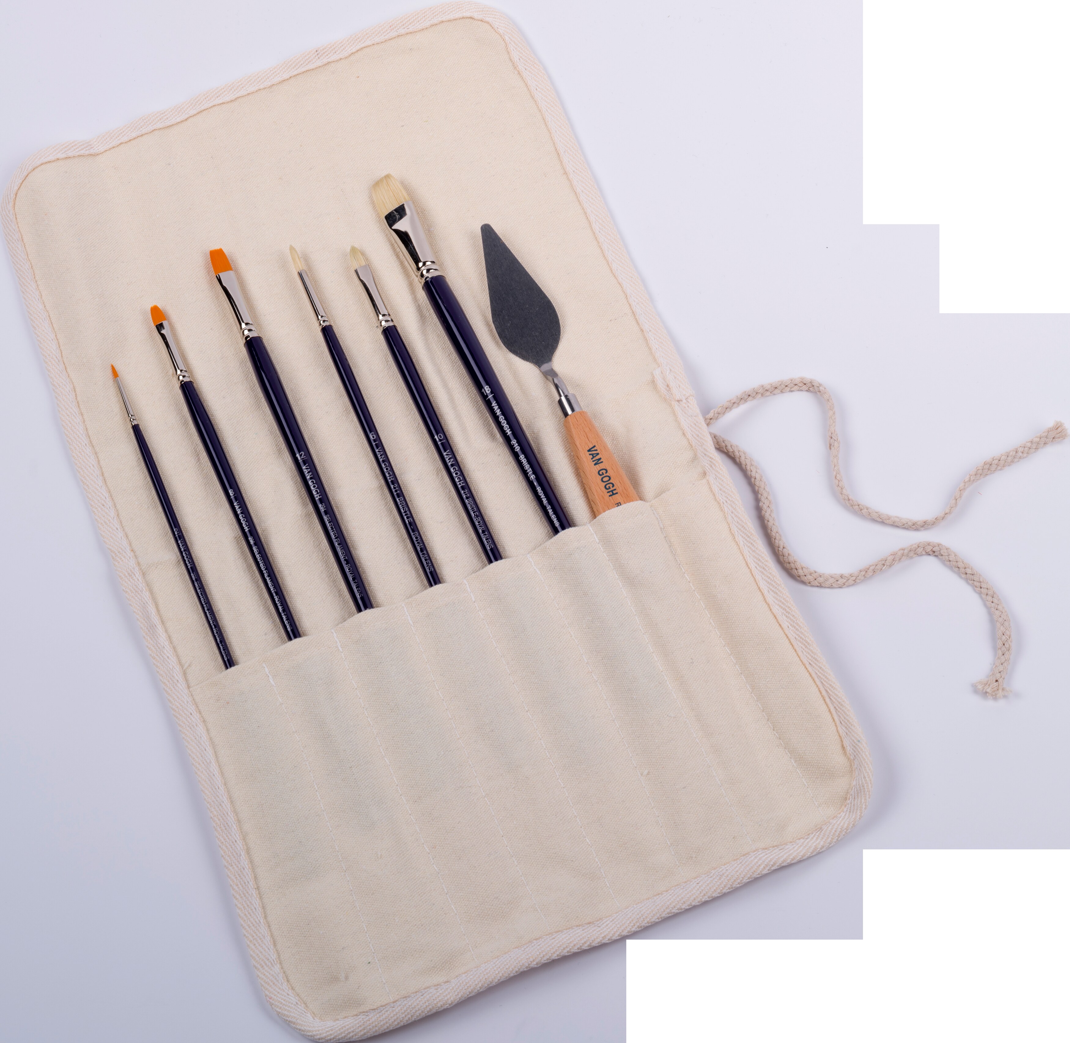 Diese mit Sorgfalt gefertigte und von Hand geformte Van Gogh-Pinsel-Rolle enthält 6 verschiedene Öl- und Acrylpinsel. Das Set enthält 3 Pinsel aus robusten Schweineborsten und 3 Pinsel aus goldenen Synthetikborsten. Die Borstenpinsel haben eine natürliche Härte, die sich ideal für weniger dichte Öl- und Acrylmaltechniken eignet. Die Flexibilität der goldenen Synthetikborsten ist besonders gut für die Acrylmalerei geeignet, da Acrylfarben normalerweise in einer etwas flüssigeren Konsistenz verwendet werden. Set-Inhalt: <br>Van Gogh Pinsel Serie 210 - robuste Schweineborste, flach Nr.18 - Van Gogh Pinsel Serie 211 - robuste Schweineborste, rund Nr.06 - Van Gogh Pinsel Serie 212 - robuste Schweineborste, Katzenzunge Nr.10 - Van Gogh Pinsel Serie 294 - goldene Synthetikborsten (fein), flach Nr.12 - Van Gogh Pinsel Serie 295 - goldene Synthetikborsten (fein), rund Nr.02 - Van Gogh Pinsel Serie 296 - goldene Synthetikborsten (fein), Katzenzunge Nr.06 - Canvas Pinseltasche - Van Gogh Malmesser