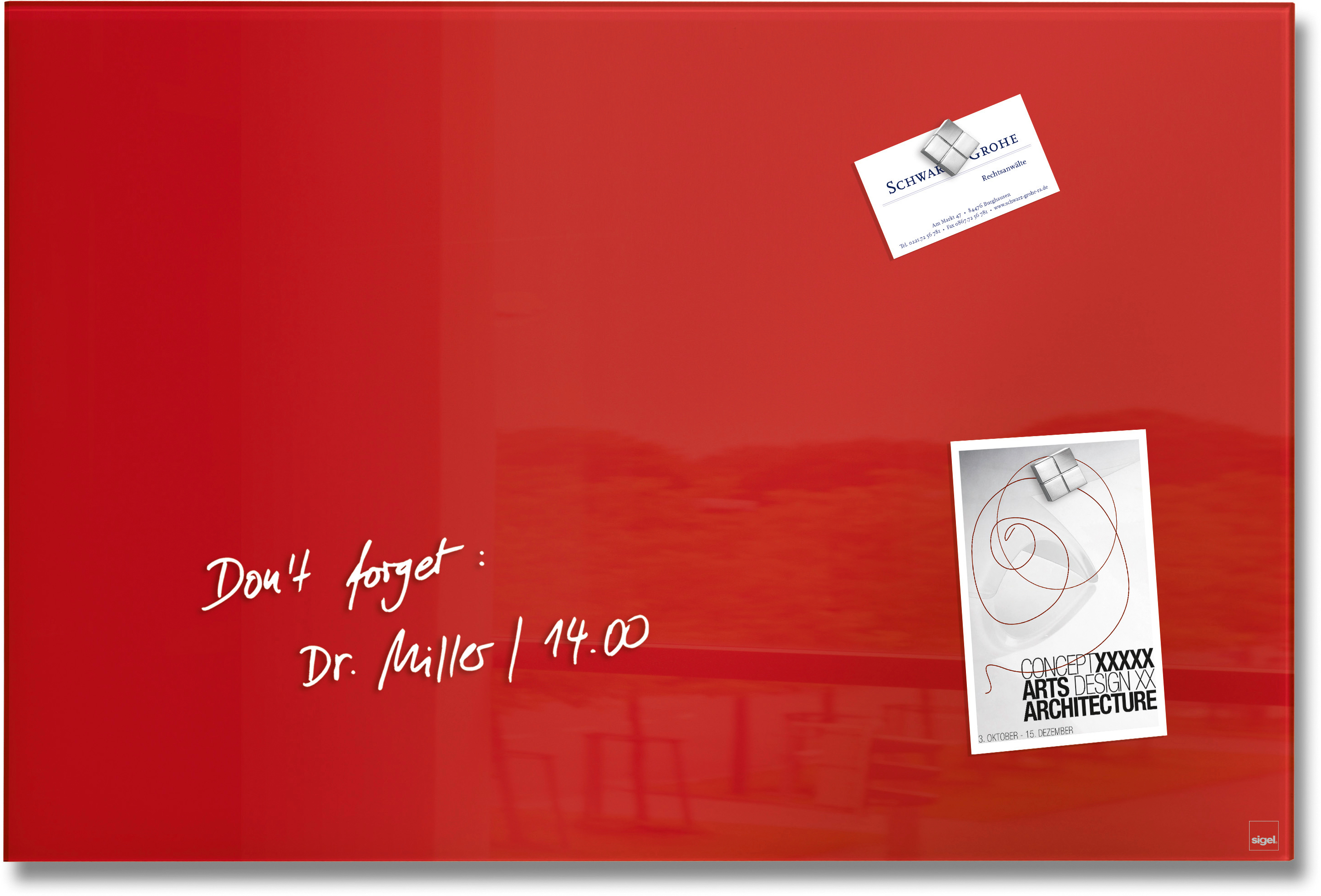 Hochglänzendes, designprämiertes Glas-Magnetboard artverum®. Magnethaftend mit SuperDym-/Neodym-Magneten und mit Sigel Markern optimal beschreibbar. Gefertigt aus Sicherheitsglas (ESG, EN 12150-1). Die rahmenlose Aufhängung lässt das Glas-Magnetboard frei vor der Wand schweben. Die TÜV- und GS-geprüfte Produktsicherheit und die TÜV-geprüfte Aufhängung sorgen für einen sicheren Halt im Hoch- und Querformat. Sigel gewährt 25 Jahre Garantie auf die Glasoberfläche bei Verwendung von Sigel-Zubehör.