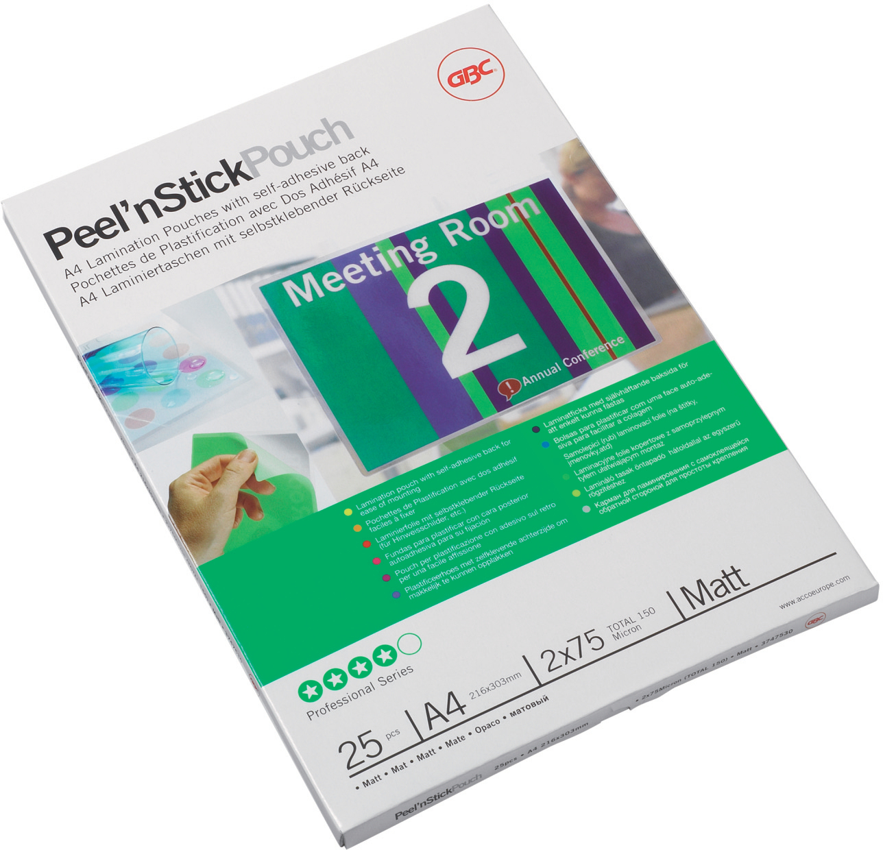 GBC Peel n’ Stick Laminiertaschen sind perfekt geeignet um schnell und einfach professionelle Schilder zu erstellen. Die selbstklebende Rückseite haftet auf den meisten Oberflächen wie z.B. Glas, Metall und Karton. Einfach die Folie vom Trägerpapier abziehen, aufkleben und fertig.