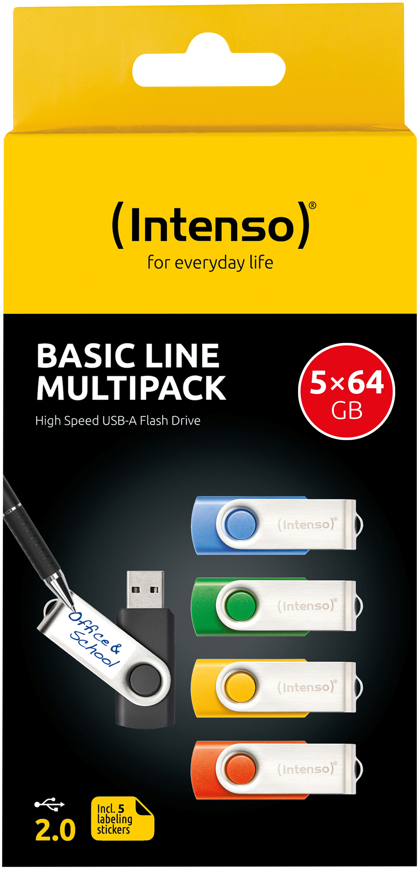 Die Basic Line Multipacks von Intenso sind die perfekte Lösung für Dich, wenn du regelmäßig Daten transportierst und speicherst. Verschiedene Kapazitäten und frische Farben wie Gelb, Grün, Schwarz, Blau und Orange bieten Dir volle Flexibilität und einen coolen Look. Dank des kompakten Designs und des robusten Metallbügels kannst Du die USB-Sticks überall easy mitnehmen. Praktisch, modern – genau richtig für Deinen Alltag. Die Basic Line Multipacks überzeugen durch schnelle und zuverlässige Datenübertragung dank der bewährten High-Speed USB 2.0 Schnittstelle. Mit Lesegeschwindigkeiten von bis zu 28 MB/s und Schreibgeschwindigkeiten von bis zu 6,5 MB/s sind Deine Daten im Handumdrehen übertragen. Perfekt für Deinen Alltag – ob Arbeit, Schule oder private Projekte. Einfach praktisch. Einfach schnell. Egal, was Du speichern möchtest, die Basic Line Multipacks bieten Dir die passenden Optionen: von 10 x 4 GB über 5 x 8 GB bis hin zu 5 x 64 GB. Die USB-Sticks bestehen aus einer robusten Kunststoff-Metall-Kombination und werden mit praktischen Beschriftungsetiketten geliefert – so behältst Du immer den Überblick. Mit einem Gewicht von nur 13 g und kompakten Maßen (56 x 19 x 10 mm) sind sie besonders leicht und passen in jede Tasche. Kompatibel mit Windows 8 oder neuer sowie macOS 10.x oder höher, lassen sich die Basic Line USB-Sticks flexibel einsetzen. Perfekt für unterwegs – und für alles, was Du sonst noch vorhast.