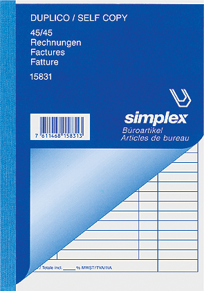 Die SIMPLEX DUPLICO Rechnungen bestehen aus weissen Seiten, welche zusätzlich zum Original jeweils automatisch eine gelbe Direktkopie machen. Die Formulare sind 3-sprachig verfasst (D/F/I).