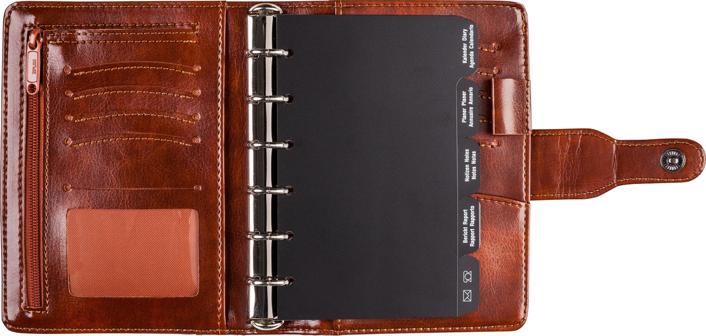 - Innen rechts: Grosse Klemmecke, Rundöse für Schreibgeräte, Schlitztaschen für Visitenkarten