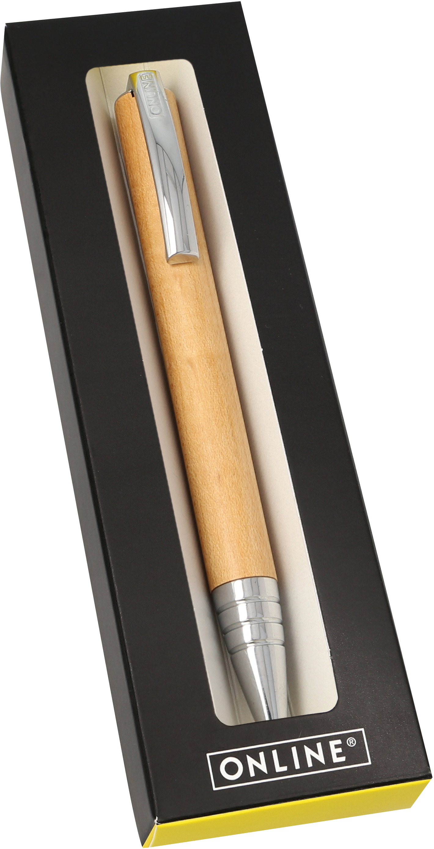 Der VISION Design-Kugelschreiber von ONLINE aus Holz & Metall in modernem Design, überzeugt in seiner außergewöhnlichen Ausstrahlung. Ausgestattet mit einem edlen Design-Metallclip, einer hochwertigen Dreh-Mechanik, und einer Großraummine aus Metall in der Schreibfarbe Schwarz garantiert der Kugelschreiber Schreibvergnügen pur – für den gehobenen Anspruch. Dieser Kugelschreiber beweist Kompetenz in Qualität, Design und Trend, verpackt einer Box.