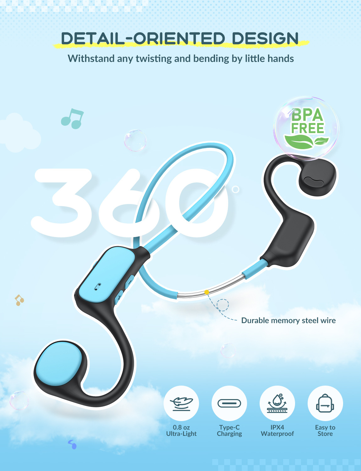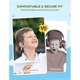 Mit den iClever OWS01 erleben Kinder Musik, Hörspiele und Online-Lernen auf eine völlig neue Art. Dank innovativer Air-Conduction-Technologie liegen die Kopfhörer nicht im oder auf dem Ohr, sondern leiten den Klang sanft und klar an die Ohren weiter. So bleiben die Ohren frei, die Umgebung hörbar – und die Sicherheit stets gewährleistet. Das federleichte Design wiegt kaum 23 g und sorgt zusammen mit einem ergonomischen Drei-Punkt-Drucksystem für höchsten Tragekomfort, auch bei längerer Nutzung. Weiches, hautfreundliches Material macht das Tragen angenehm, während der flexible 360°-Bügel aus Memory-Wire jede Bewegung mitmacht. Ausgestattet mit modernen 14,2 mm-Treibern und DRC-Technologie liefern die OWS01 einen klaren, natürlichen Stereo-Sound mit ausgewogenen Bässen. Die Lautstärke lässt sich auf 74 dBA für den Alltag oder 85 dBA für lautere Umgebungen begrenzen – optimaler Schutz für empfindliche Kinderohren. Mit Bluetooth 5.4 verbinden sich die Kopfhörer schnell und stabil mit Smartphone, Tablet oder Laptop – kabellos, unkompliziert und zuverlässig.