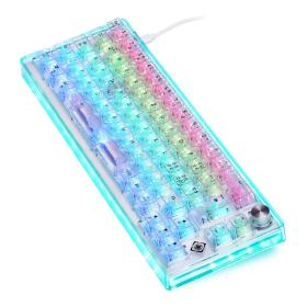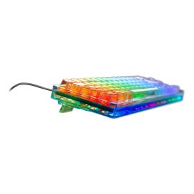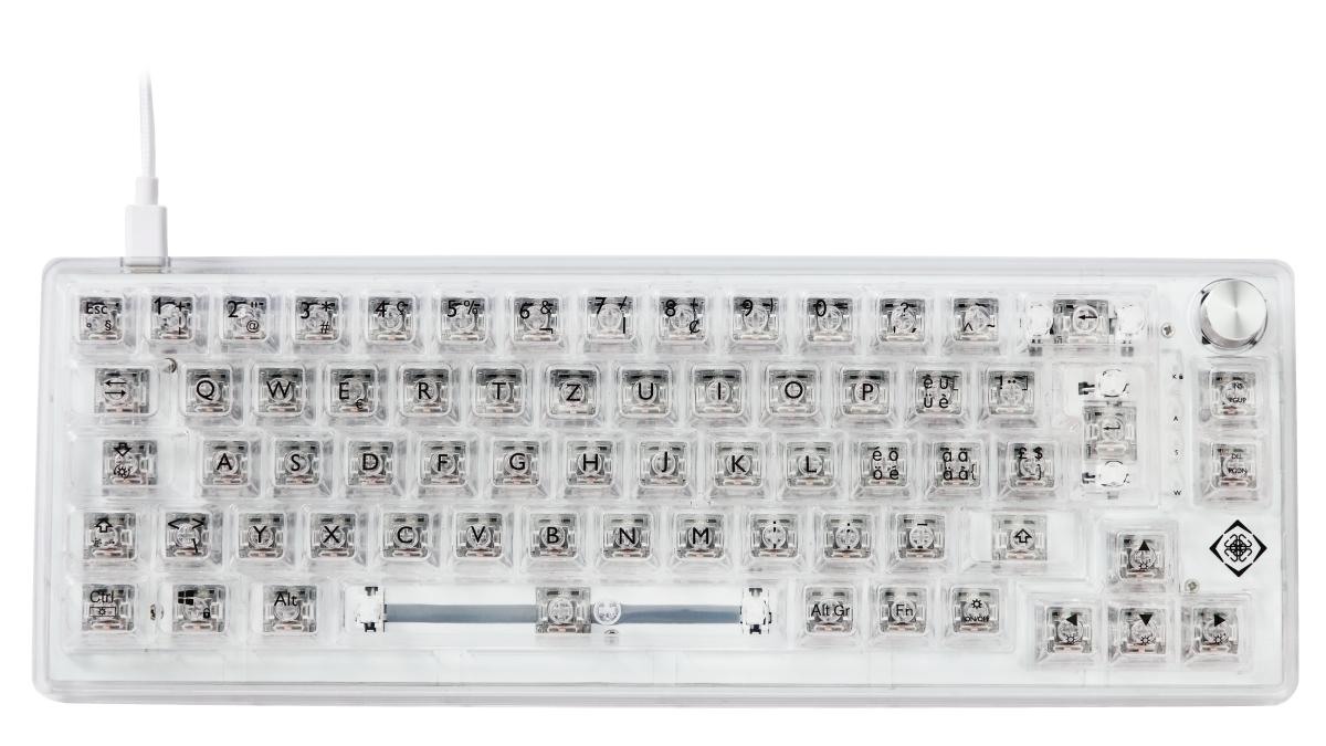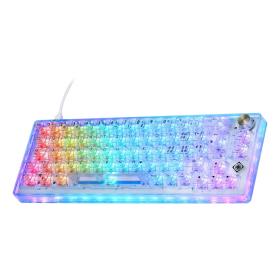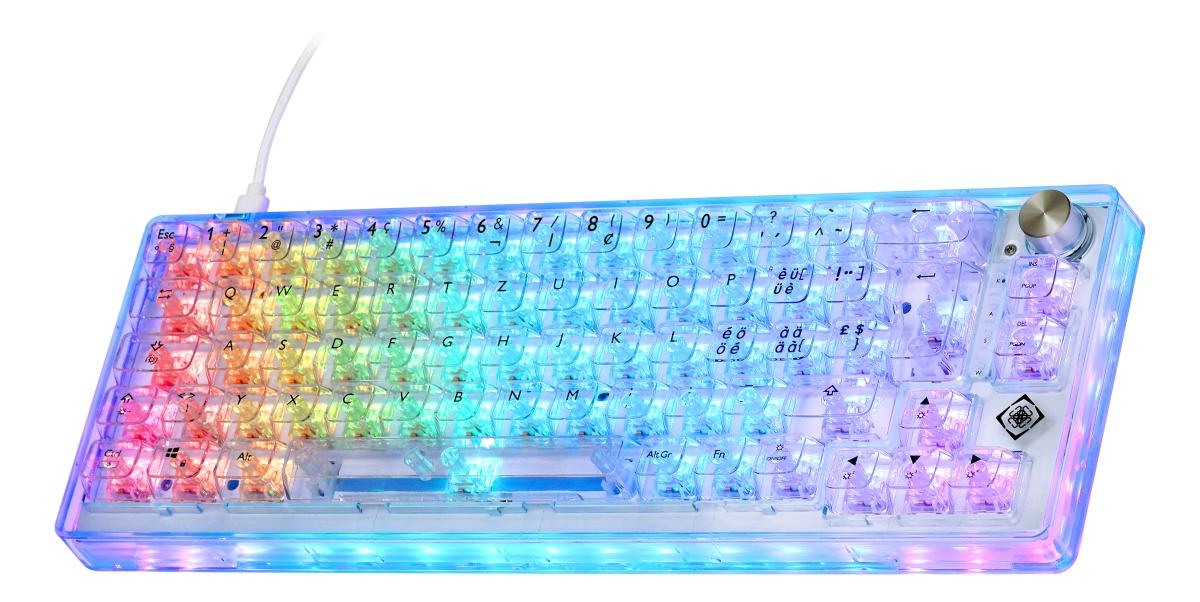 Eine kompakte 65% mechanische Tastatur, kombiniert mit einem vollständig transparenten Design und lebendiger RGB-Beleuchtung bringt diese Tastatur Ihr Spielerlebnis auf ein neues Niveau. Mit N-Key-Rollover, KTT-Schaltern, Hot-Swap-Funktionalität und herunterladbarer Software haben Sie die Flexibilität, Ihre Einstellungen anzupassen. 100% Gaming in einem 65% Layout. Diese kompakte Tastatur bietet spezielle Pfeiltasten und Funktionstasten. Ob Sie unterwegs sind oder auf dem Schreibtisch nur wenig Platz haben, können Sie sie mühelos mitnehmen, damit Sie überall spielen können. Illuminiert und farbenfroh bis zum max..Das transparente Design in Kombination mit dem Leuchteffekt, der durch die leuchtende RGB Beleuchtung erhöht die Sichtbarkeit und verwandelt diese Tastatur in ein optisch auffälliges Gerät. Verschiedene Beleuchtungskonfigurationen können bestimmten Tasten oder Tastengruppen zugewiesen werden. Ausserdem bietet diese Tastatur eine einzigartige Funktion, die ermöglicht es Ihnen, die Beleuchtung sowohl der Tasten als auch an den Seiten der Tastatur mit nur wenigen einfachen Tastenanschlägen anpassen können. N-Tasten-Rollover. Diese Funktion ermöglicht gleichzeitige Tastenbetätigungen ohne Interferenzen, jede Taste wird separat erkannt. Gamer profitieren von der Möglichkeit, mehrere Tasten gleichzeitig zu drücken. Hot-Swap-fähige Schalter Bekannt für ihr taktiles Feedback und ihre Reaktionsfähigkeit, bieten diese KTT linearen Schalter ein befriedigendes Klicken und schnelle Betätigung für präzisen Tastenbetätigungen. Die Tastatur bietet ausserdem Hot-Swap-fähige Schalter für einfache Anpassungen ohne Ausschalten oder Neustart. Drehknopf Der praktische Drehknopf ermöglicht schnelle und einfache Einstellung der Lautstärke ohne die Notwendigkeit der Suche nach Lautstärketasten. Anpassen mit Software Passen Sie die Tastatur mit der mitgelieferten Software an. Übernehmen Sie die volle Kontrolle der RGB-Beleuchtung mit 16 Millionen Farben, erstellen Sie Makros, speichern Sie eigene Profile speichern und zwischen ihnen wechseln nach Bedarf.