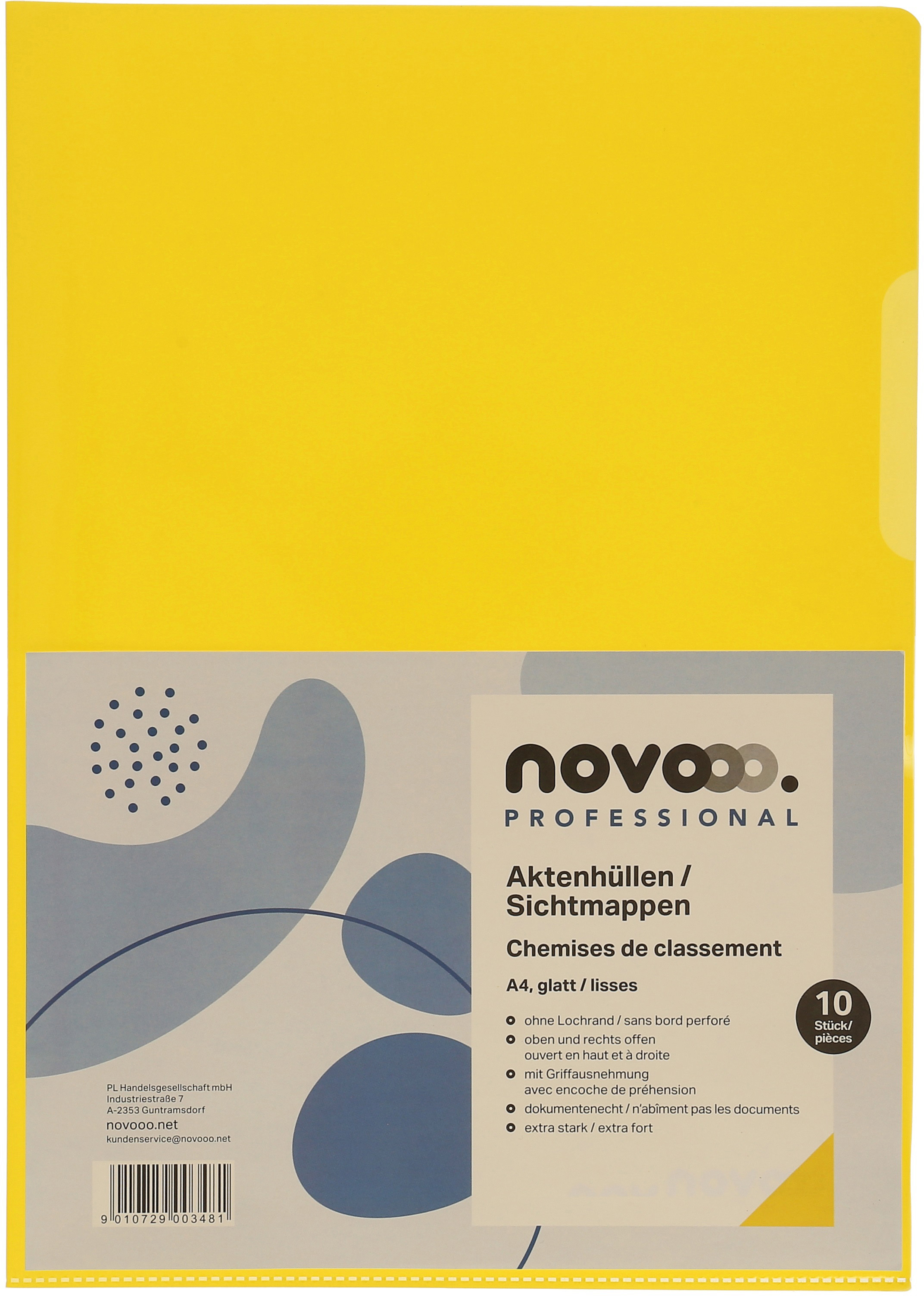 Die NOVOOO Sichtmappen sind aus glattem Polypropylen mit einer Stärke von 140 µm hergestellt. Die Hüllen sind oben sowie seitlich geöffnet und haben einen Greifausschnitt zur leichten Entnahme. Mit den Aktenhüllen im Format DIN A4 sind Unterlagen dokument