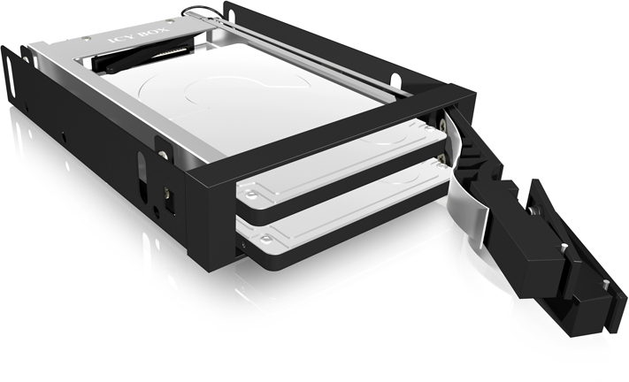 Eingebaut in einen 3,5" Schacht, hat jede Festplatte einen eigenen Schacht, in den sie einfach montiert und auch wieder entfernt werden kann. Der Ein- und Ausbau der Festplatten geschieht träger- und somit auch werkzeuglos. Beide Festplattenträger können separat voneinander auf- oder abgeschlossen werden. Unbefugte erhalten keinen Zugriff auf die Festplatten. Intern wird der Wechselrahmen über 2x SATA Konnektoren angeschlossen. Für die LED- Anzeigen gibt es zwei separate 4-Pin Anschlüsse. Das Gehäuse ist vornehmlich aus Metall, wobei die Frontblende noch extra aus hochwertigem Aluminium gefertigt ist. Metalle sind für ihre hervorragende Wärmeleitfähigkeit (passive Konvektion) bekannt. Das sorgt für eine gewisse Kühle, ohne den Wechselrahmen im Gebrauch laut zu machen.