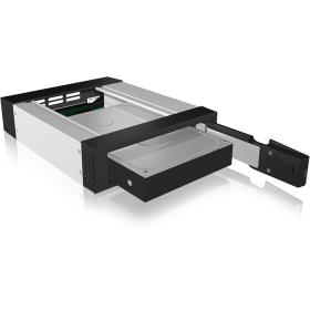 Dadurch, dass man die 3,5" Festplatte nicht in einem Träger fixieren muss, braucht man keine Schraubendreher und der Ein- und Ausbau kann doppelt schnell über die Bühne gehen. Der Platz eines 5,25" Schachts wird benötigt. Unterstützt werden SATA Festplatten mit der Geschwindigkeit von SATA I, II und III. Das Gehäuse des Wechselrahmens ist nahezu komplett aus Aluminium, nur die Front- und Heckplatte sind aus Hartplastik. Optional lässt sich ein 12V Lüfter anschliessen (nicht im Lieferumfang). Damit die Festplatte vor unbefugten Zugriffen geschützt bleibt, lässt sich der Festplattenslot abschliessen. Eine LED zeigt Betrieb und Zugriff an, jedoch gibt es keinen Alarm bei Festplattenfehlern oder Ähnlichem. Wem die Ruhe heilig ist, wird es geniessen.