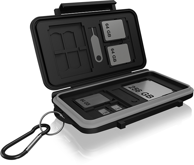 Die Schutzbox von ICY BOX ist aus hochwertigen und umweltfreundlichen Materialien gefertigt. Sie hat eine stabile und belastbare Hülle und massgeschneiderte und geformte Schaumstoffeinsätze im Innern, welche ausgewählte Speicherkarten aufnehmen und sie vor Stössen, Staub und Spritzwasser schützen. Mittels des Silikon-Dichtringes kann die Schutzbox Staub und Feuchtigkeit wirksam fernhalten. Darüber hinaus ermöglicht der ergonomische Verriegelungsclip ein einfaches Öffnen und Schliessen. Ein zuverlässiges Utensil für die Aufbewahrung und den Transport Ihrer empfindlichen Speicherkarten.
