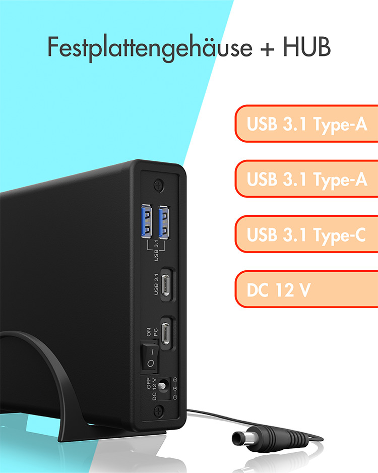 Das IB-382H-C31 ist nicht nur ein Gehäuse für eine 2,5" oder 3,5" Festplatte. Auf der Rückseite ist ausserdem ein USB 3.2 (Gen 2) Hub verbaut, der für optimale Konnektivität mit bis zu 10 Gbit/s sorgt. Ein blauer, stylischer LED-Ring auf der Vorderseite zeigt den aktuellen Status der Festplatte an. In dem IB-382H-C31 finden nicht nur die grossen 3,5"" Festplatten Platz, es können auch schnelle 2,5"" SATA SSDs verbaut werden, um den Performanceschub der USB 3.2 (Gen 2) Schnittstelle voll ausnutzen zu können. Nicht nur der verbaute Datenträger ist mit USB 3.2 (Gen 2) angebunden und transferiert Ihre Daten blitzschnell von A nach B. Die drei USB Anschlüsse auf der Rückseite unterstützen ebenfalls USB 3.2 (Gen 2) mit bis zu 10 Gbit/s. So können auch weitere USB Geräte leistungsstark bedient werden.