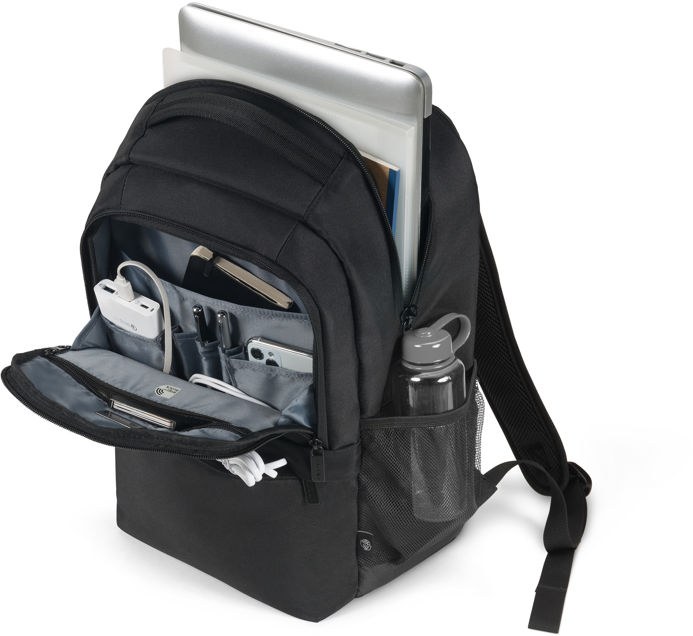 Mit einem grosszügigen Stauraum von 24 Litern bietet der Rucksack Eco CORE ausreichend Platz für den täglichen Bedarf. Das mit High-Density Foam (HDF) gepolsterte Notebookfach schützt den Laptop sicher, während das geräumige Hauptfach mit praktischer Unterteilung die Organisation von Dokumenten und Zubehör erleichtert. Die Vordertasche ist speziell für mobiles Zubehör konzipiert, und die Reissverschlusstasche bietet Stauraum für Netzteil und Kabel. Das versteckte Fach für einen GPS-Tracker ermöglicht es, den Rucksack jederzeit im Auge zu behalten, während die Reissverschlusstasche mit RFID-Blocker persönliche Daten vor unbefugtem Zugriff schützt. Für höchsten Tragekomfort sorgen gepolsterte Schultergurte mit reflektierenden Elementen für bessere Sichtbarkeit bei schlechten Lichtverhältnissen. Das ergonomisch gepolsterte Rückenteil sorgt auch bei längerem Tragen für angenehmen Komfort. Die praktischen, platzsparenden Seitentaschen bieten zusätzlichen Stauraum für Regenschirm oder Trinkflasche und das wasserabweisende Material schützt Rucksack und Inhalt bei unerwarteten Wetterumschwüngen. Der Eco CORE Rucksack vereint Stil, Funktionalität und Umweltbewusstsein in einem Produkt.