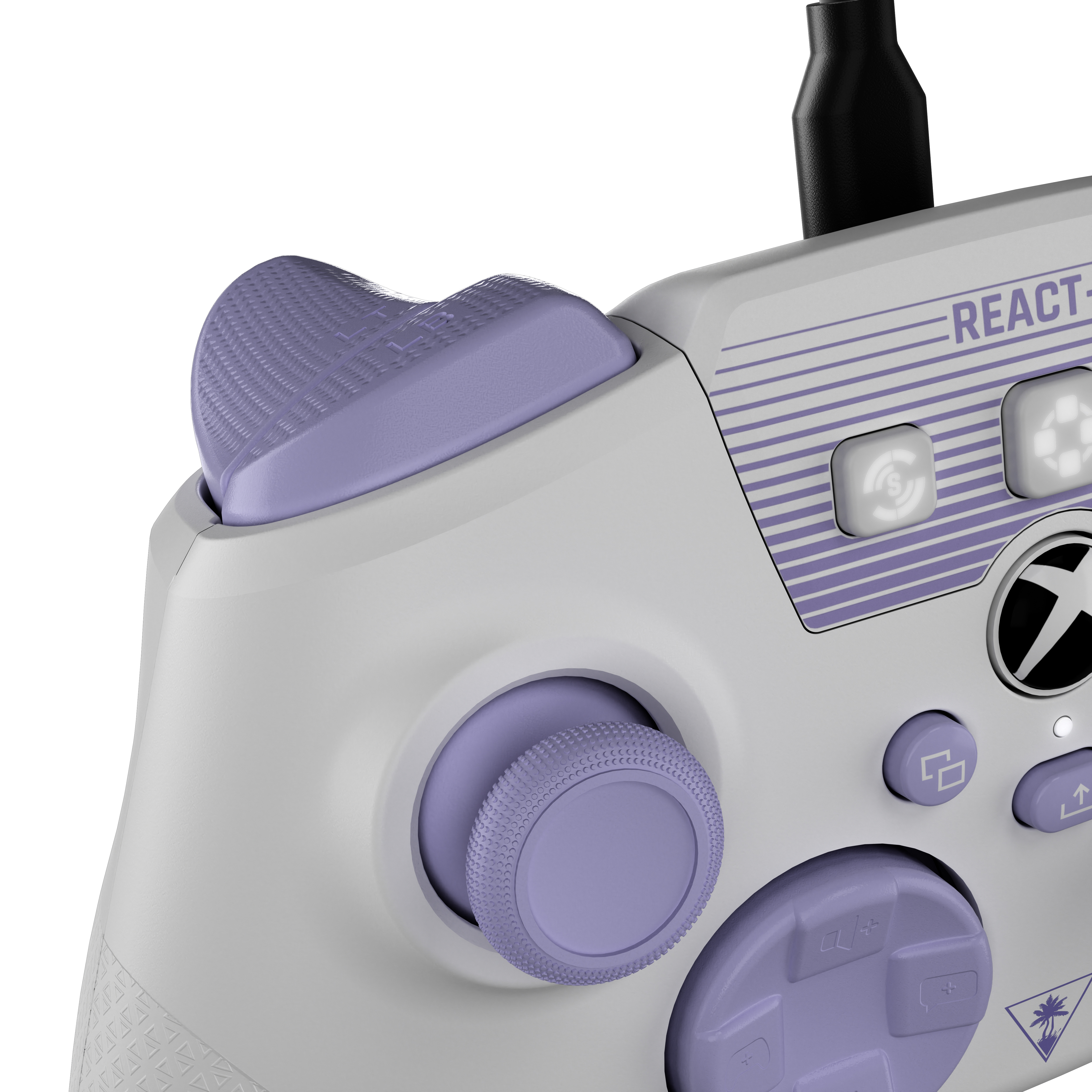 Reagiere schneller mit dem Turtle Beach® REACT-R Controller für Xbox Series X, Xbox Series S, Xbox One X, Xbox One S und Windows 10 oder 11 PCs. Verbinde ein beliebiges 3,5-mm-Headset und verbessere damit sofort dein Sound-Erlebnis durch schnell erreichbare Bedienelemente für das exklusive Superhuman Hearing, Lautstärkeregelung für In-Game- und Chat-Lautstärke sowie Mikrofonstummschaltung. Spiele länger und verliere niemals die Kontrolle dank der ergonomischen Form und den strukturierten Griffen und Trigger-Tasten. Zwei zuweisbare Schnellauslösetasten an der Rückseite des Controllers ermöglichen das Anpassen der Tastenzuweisungen für schnellere Reaktionen. Fühle das Donnern von Explosionen oder den Rückstoss nach einem Schuss durch das Vibrationsfeedback der beiden Motoren in den Griffen. Ausserdem ist der REACT-R Controller offiziell lizenziert für Xbox, du kannst dich also auf bewährte Tastenreaktionen und geschmeidige Ministick-Bewegungen verlassen.